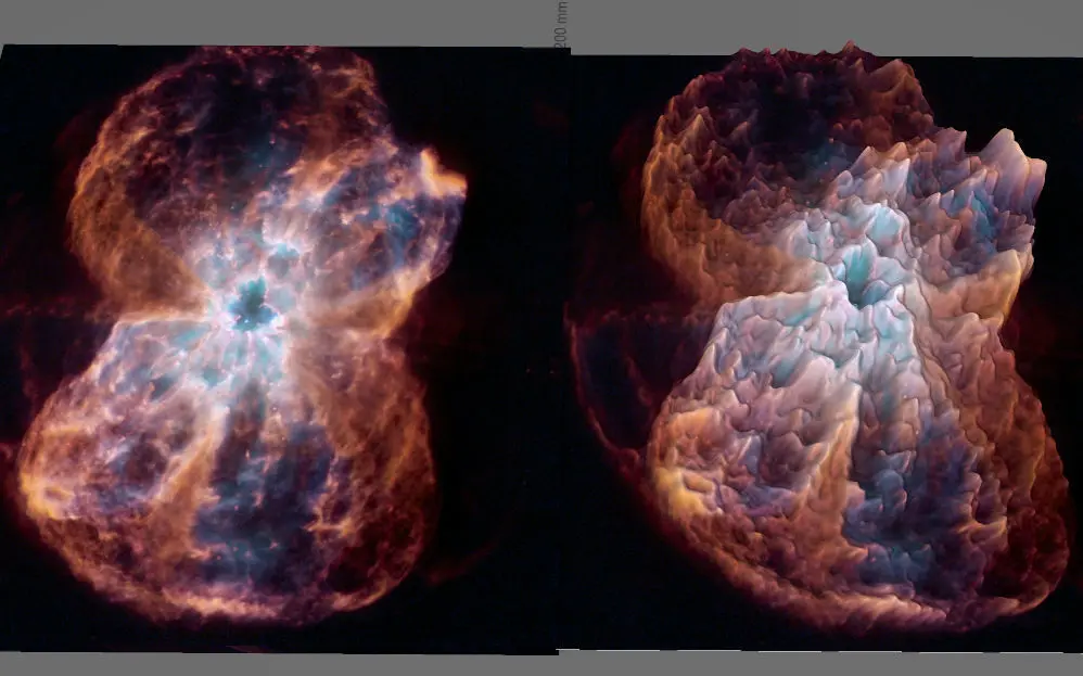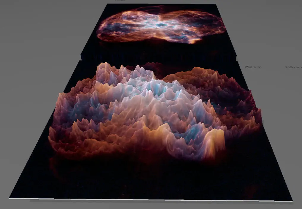 Dead exploded star, whose light traveled thousand years for the our Spaces Telescope to record its photons!Where the material becomes denser, as a result of physical processes, it will be brighter and warmer, like as the sun! Somehow, the thickening matter creates deeper and deeper holes in space-time. Based on this, I created the negative gravity map of the image with the help of software, as gravity distorts a deep pit in space-time, the texture rises on the model, thus creating gravity mountains!