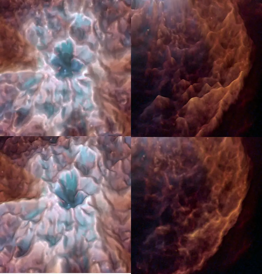 3D image obtained as a result of soft analysis of the 2D images of the new Hubble Space Telescope. The technique based on color analysis highlights the light of stars and ionized gases from the darkness of space, as gravity curves space, thus creating a spatially interpretable high-resolution 3-dimensional work.
