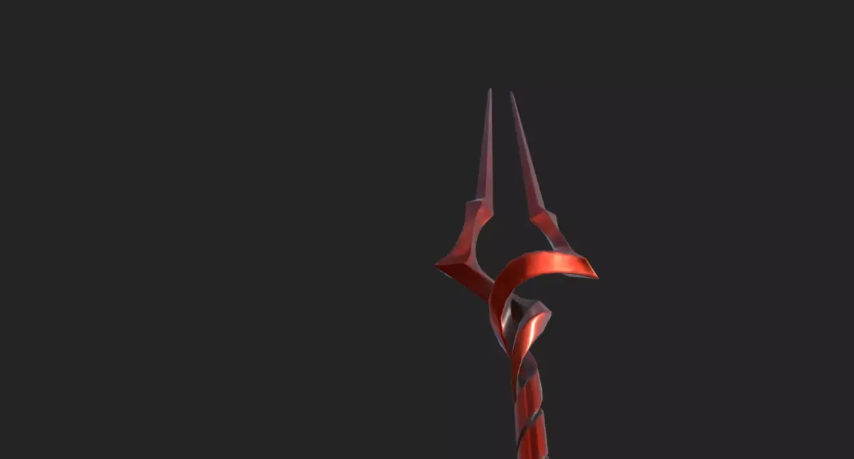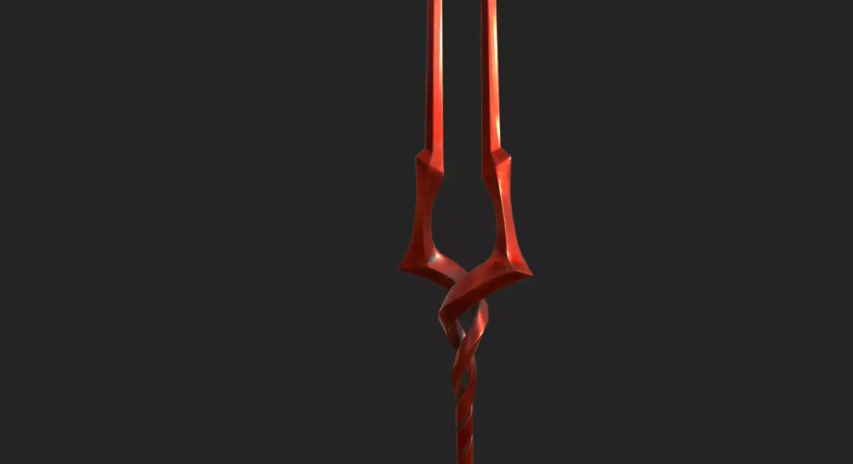The Sword of Longinus in Neon Genesis Evangelion is a tall, slender, red, double-pronged spear-like weapon with a spiraled, helical shaft that twists upward into two long, symmetrical tines. The prongs curve slightly outward, giving it a forked, almost ceremonial look. Its entire structure appears organic rather than metallic, as if it were grown rather than forged. The weapon emits a subtle, luminous sheen and is shown to be capable of piercing AT Fields with ease, making it one of the most powerful and iconic implements in the series. It also elongates dramatically when thrown, maintaining its twisting shape as it extends.