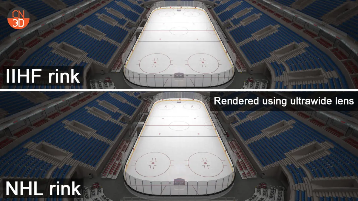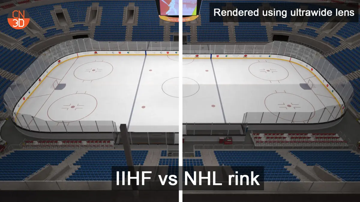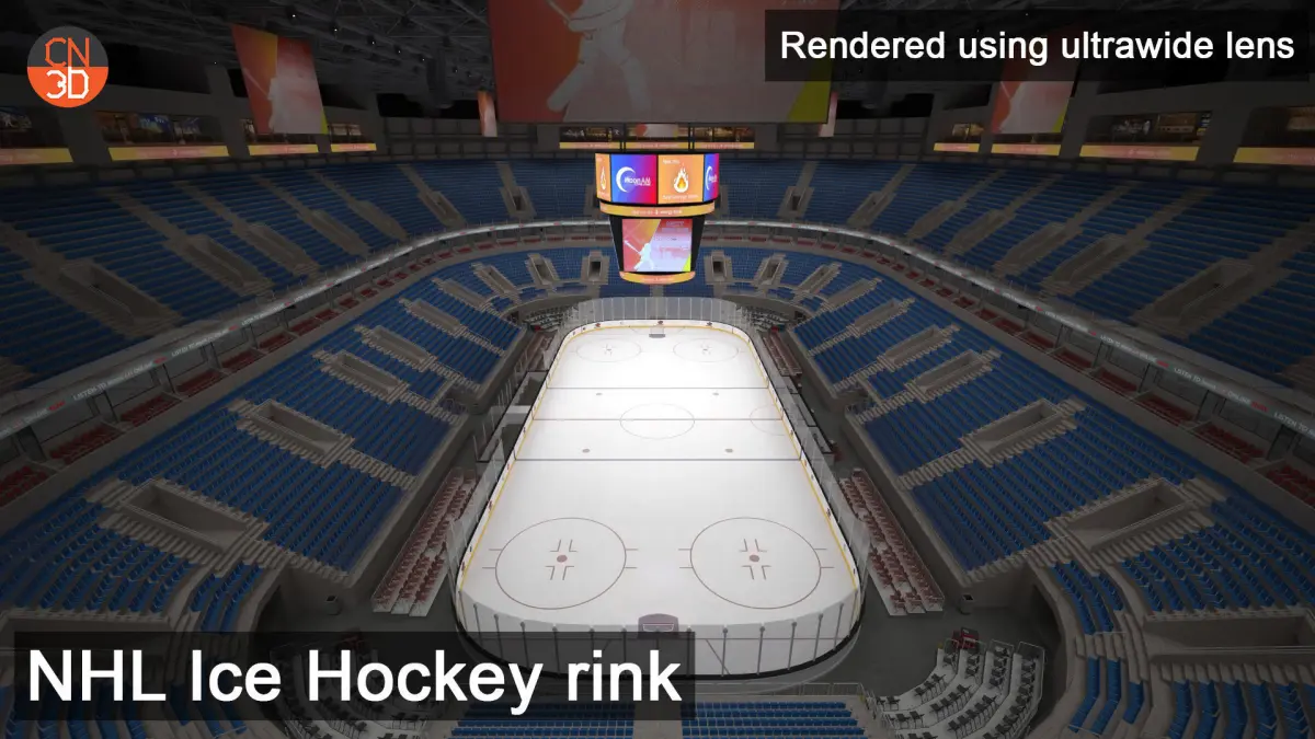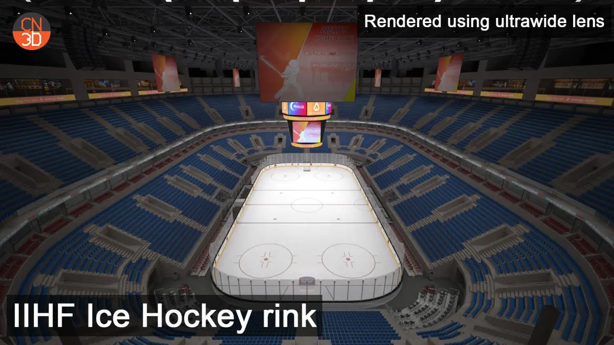 NHL and IIHF ice hockey arenas in real-world size with 18320 seats, top ads, oval ads, a large scoreboard, two levels of VIP rooms and seats, tables, detailed roof construction, and many more... NHL rink and IIHF rink are created in real units of measurement modeled on real ice rinks for NHL and IIHF.