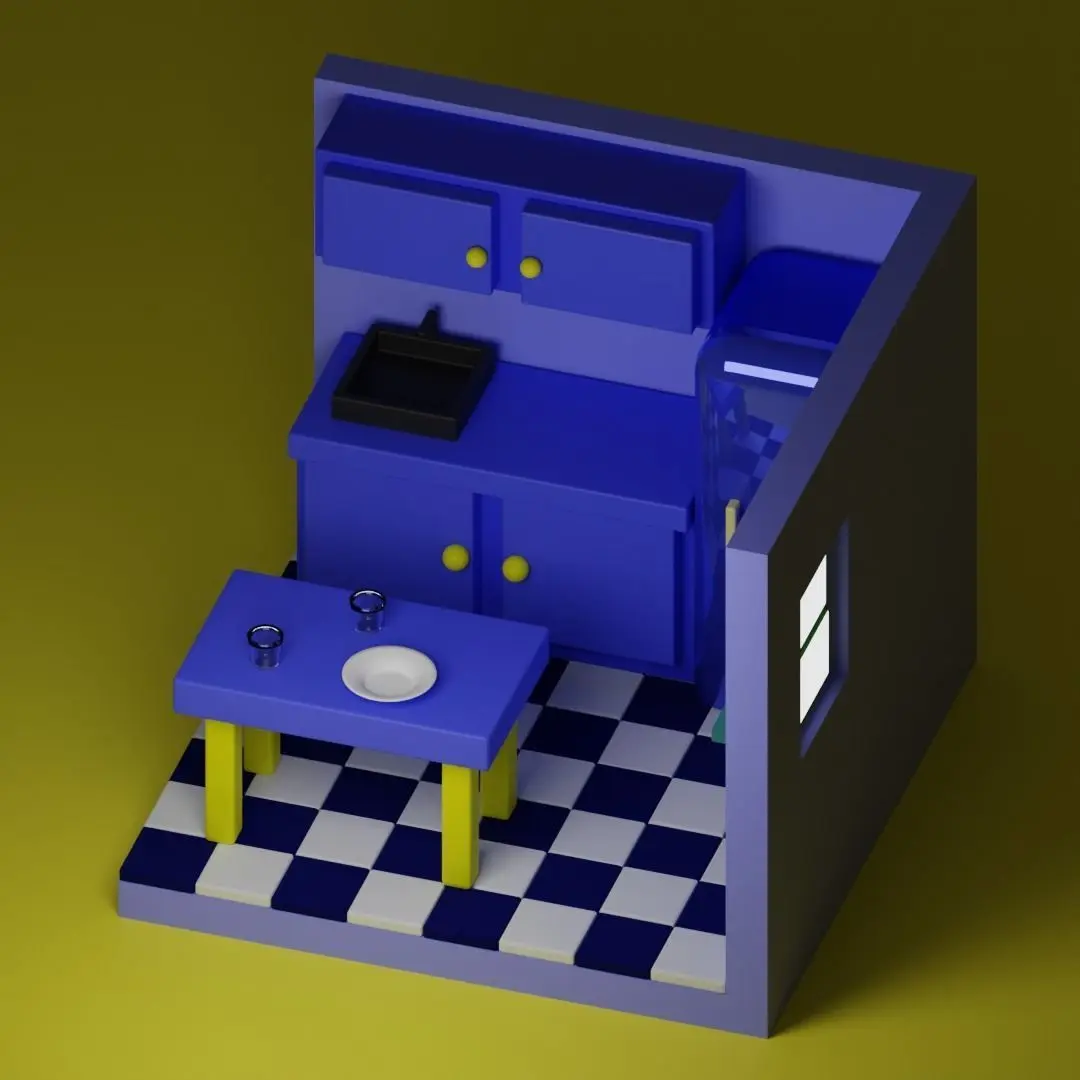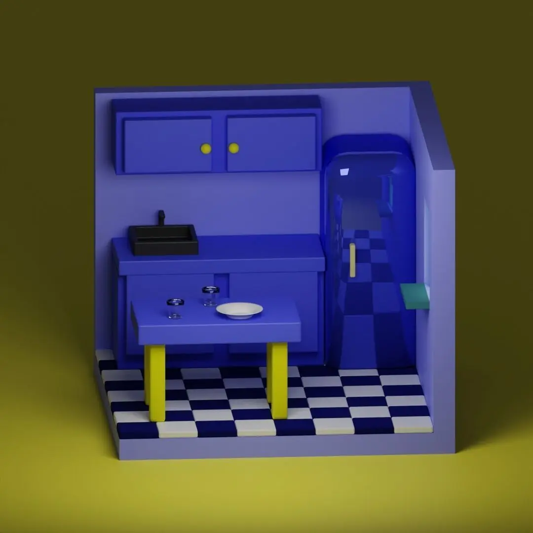 A well-equipped kitchen in which there is a refrigerator, two bedside tables, a sink, a table, a window, two glasses and one plate. The room is depicted in a minimalist style described by blue-yellow colors.