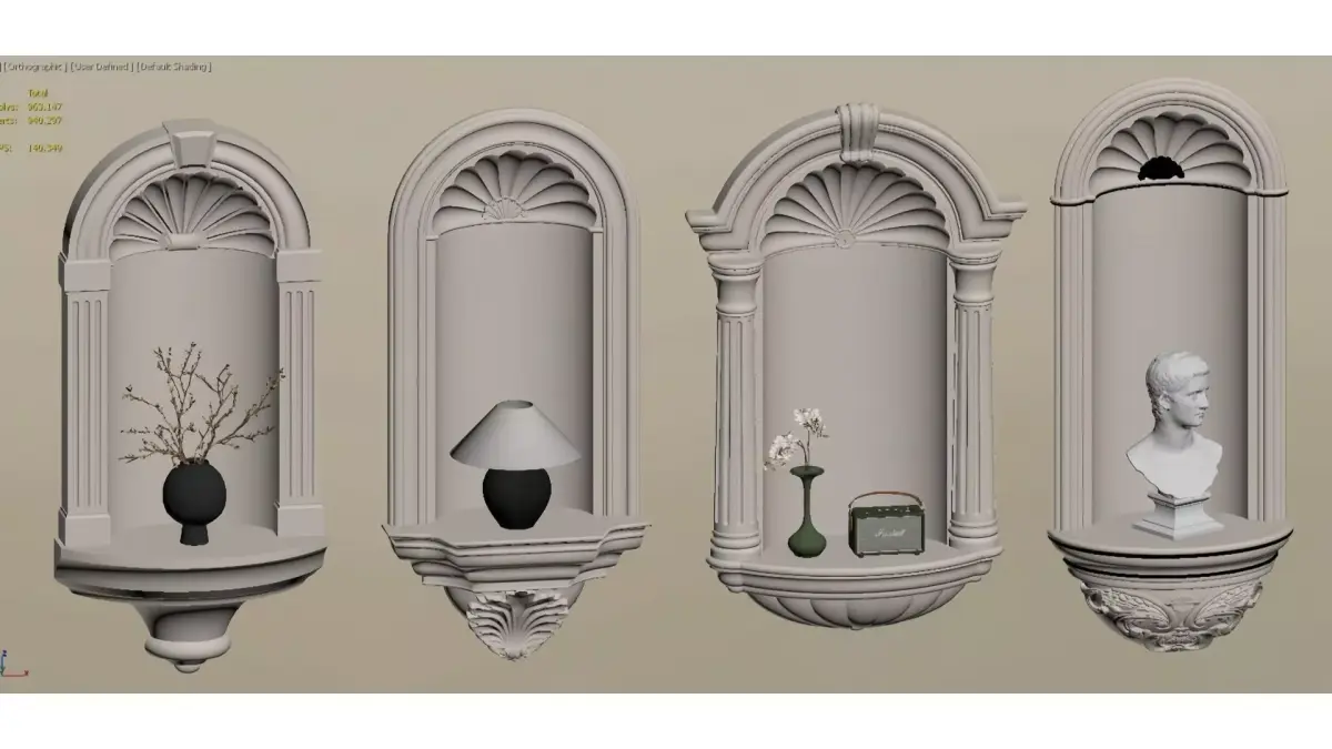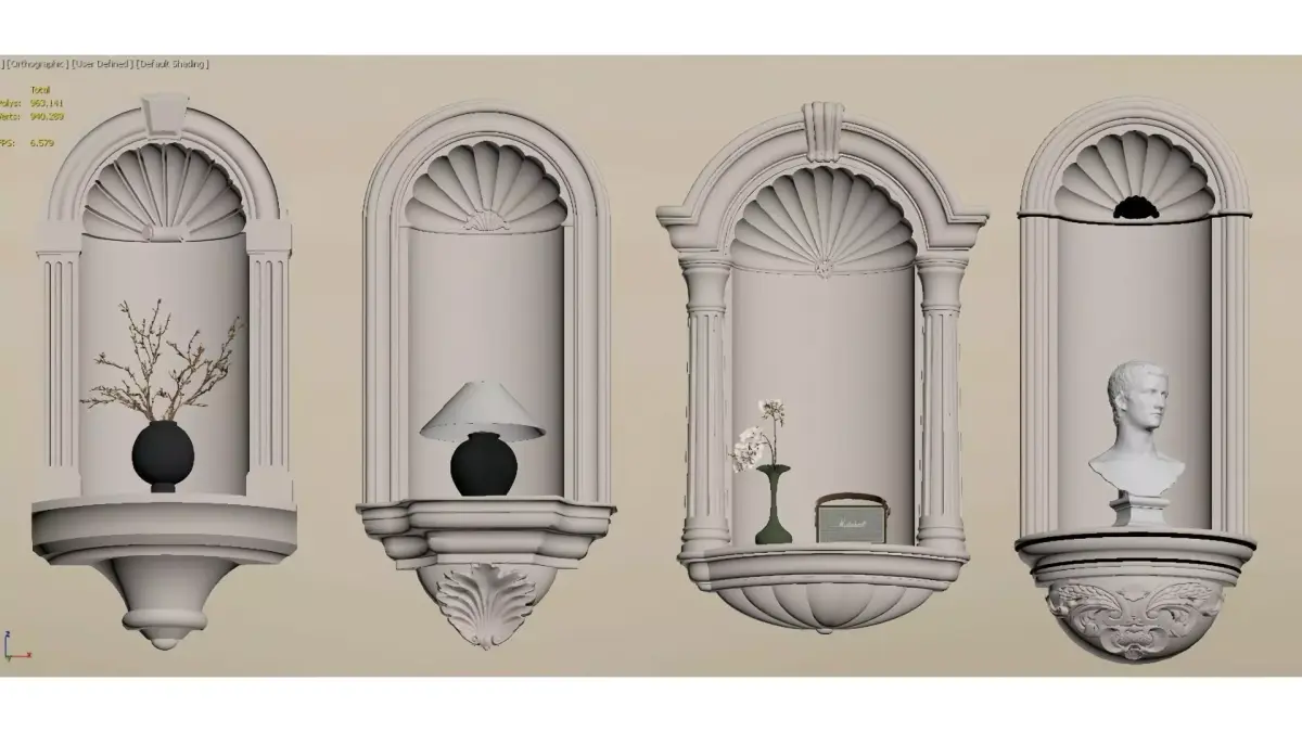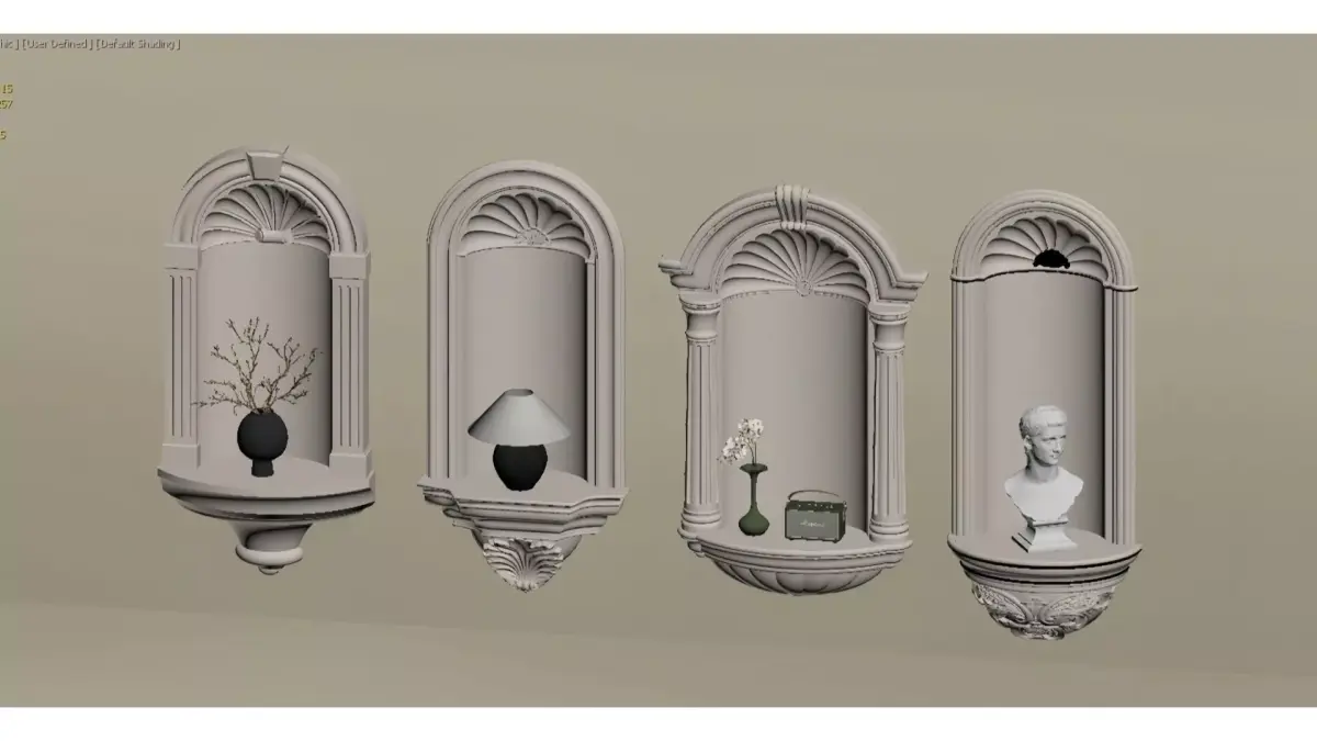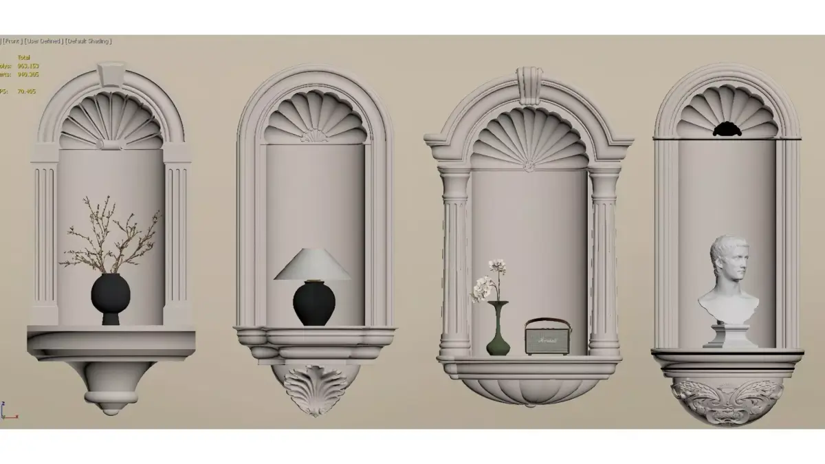 This image showcases four exquisitely designed plaster niches in a European classical style, neatly arranged on a soft beige wall. Each niche features an arched top and delicate relief details, such as fan-shaped patterns and columnar structures, with distinct decorative corbel designs at the base.Inside the niches are carefully curated soft furnishing pieces: ranging from a black vase with golden branches and a minimalist table lamp, to an elegant floral arrangement paired with a vintage radio, and finally a classic white bust sculpture. Every detail exudes a retro-luxury home aesthetic. The overall space creates an elegant, tranquil, and artistically rich atmosphere, serving as an excellent example of the fusion between classical and modern home styles.