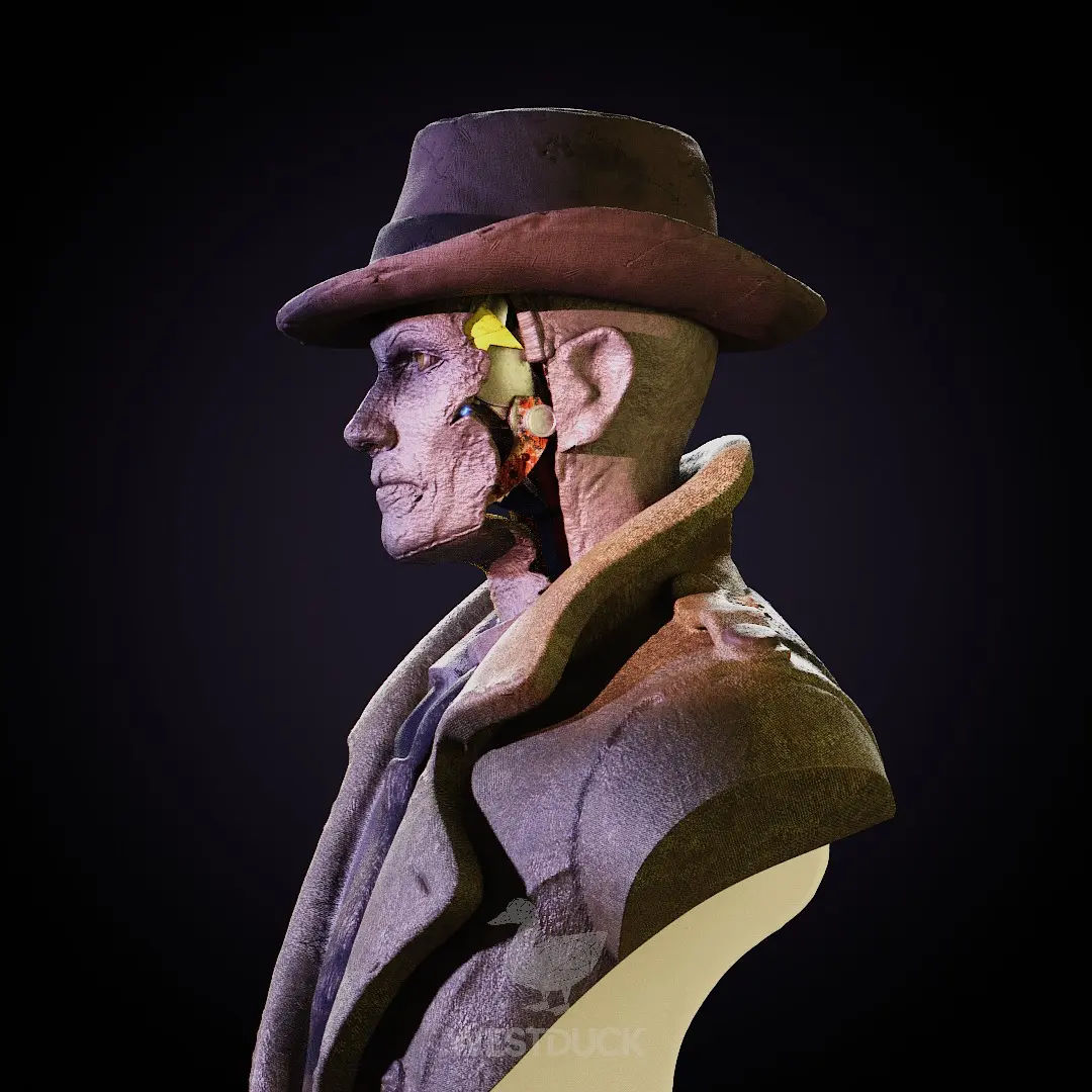 3D printable statue of Detective Nick Valentine - a companion in the Fallout 4 video game. Print as single piece with supports. Non-textured stl/obj/dae file formats.