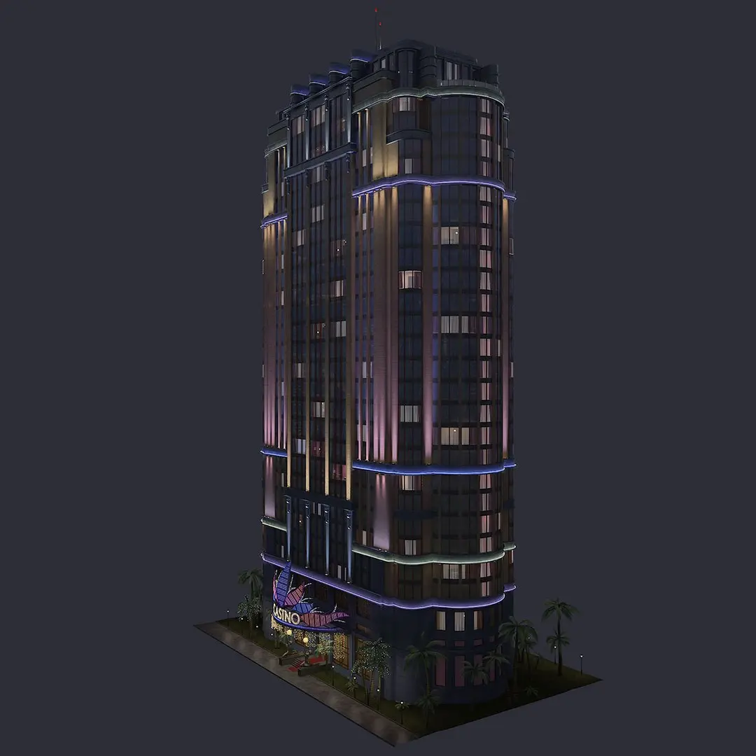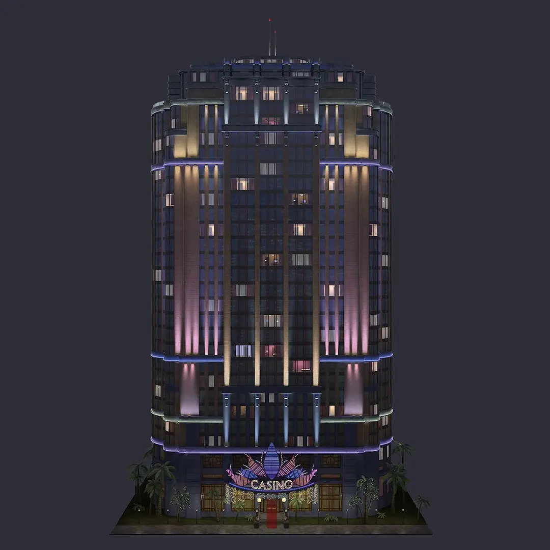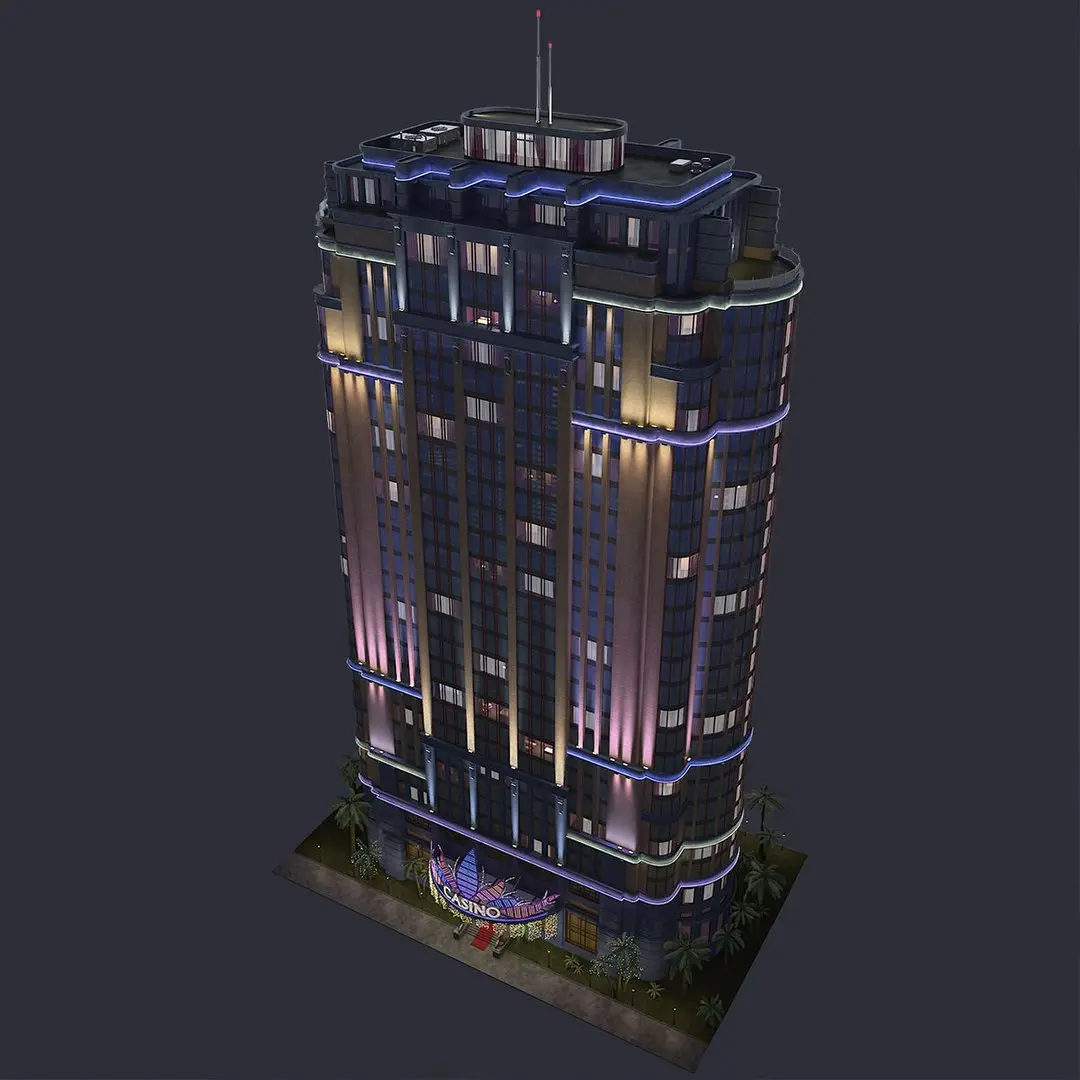 There is a model of a Night Casino Building. Render set, lights, cameras are included, you will get the result as in presentation images.