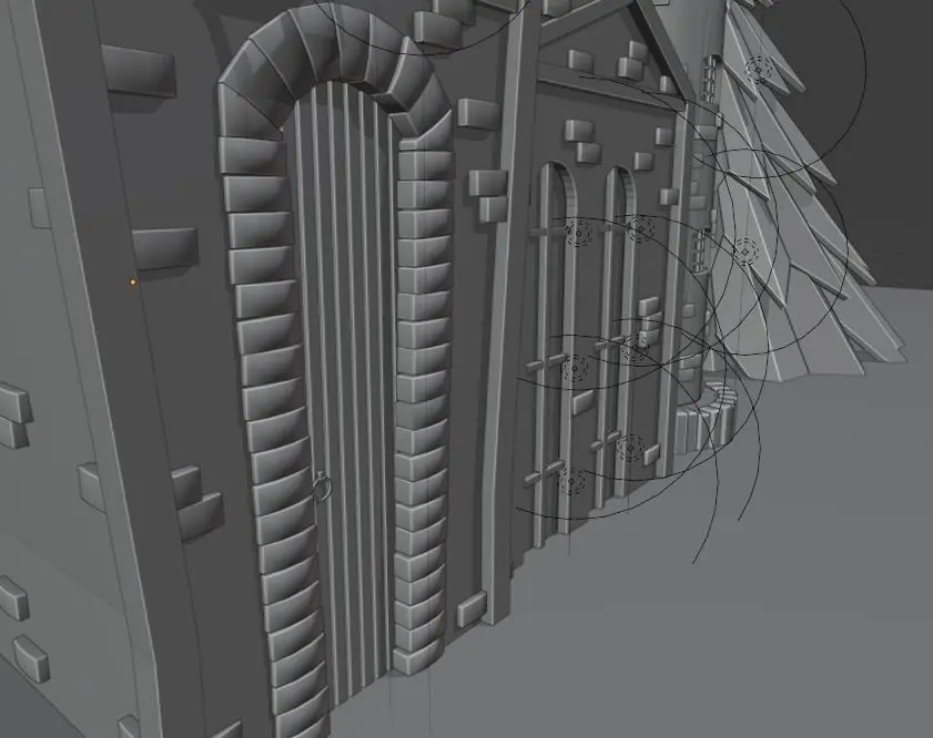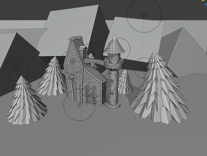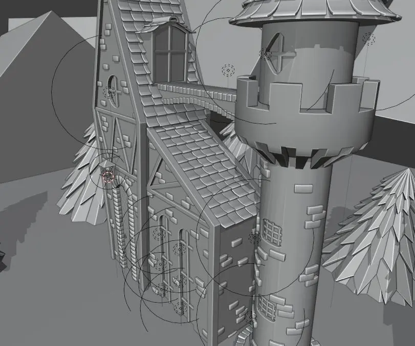 An image of a night house with a small turret. The render was created using the standard Blender engine (Eevee). The 3D scene contains 72,675 polygons and 75,124 vertices. In the 3D scene, there is a simulation of clouds and fog.