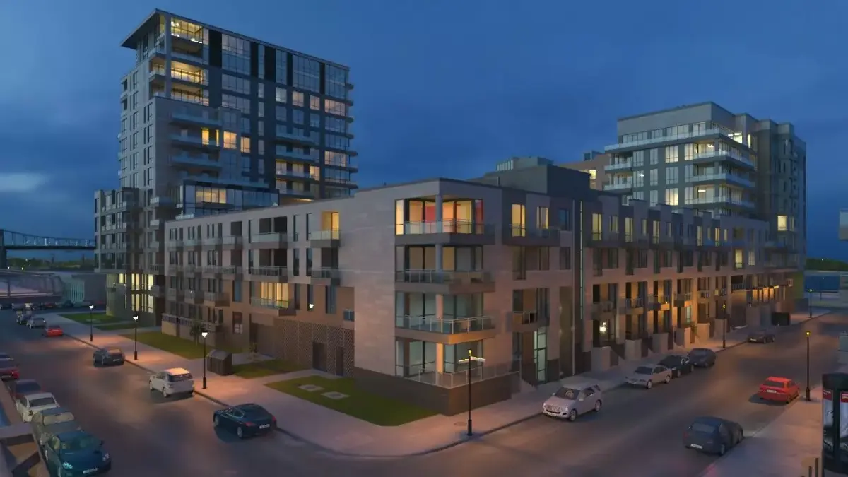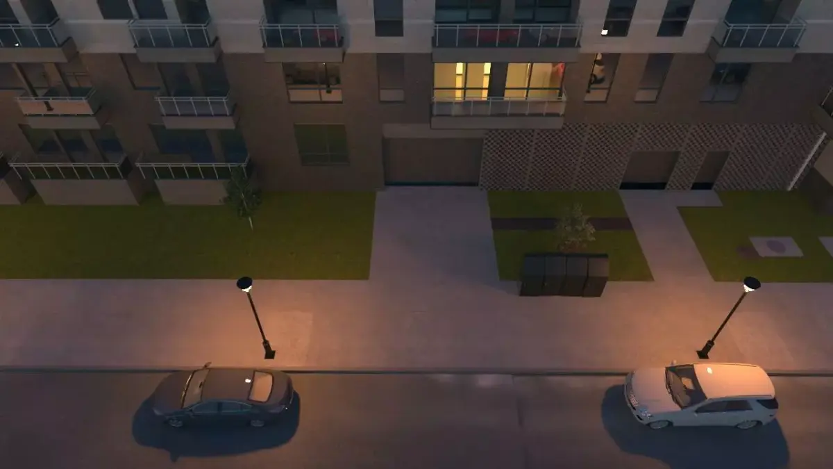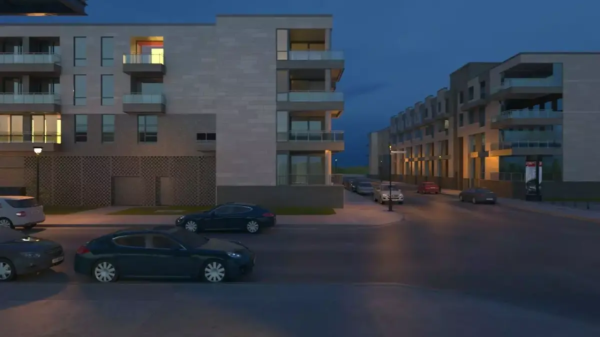 Night city street with low-poly cars. Apartment buildings, low-poly background bridge, various street elements.
