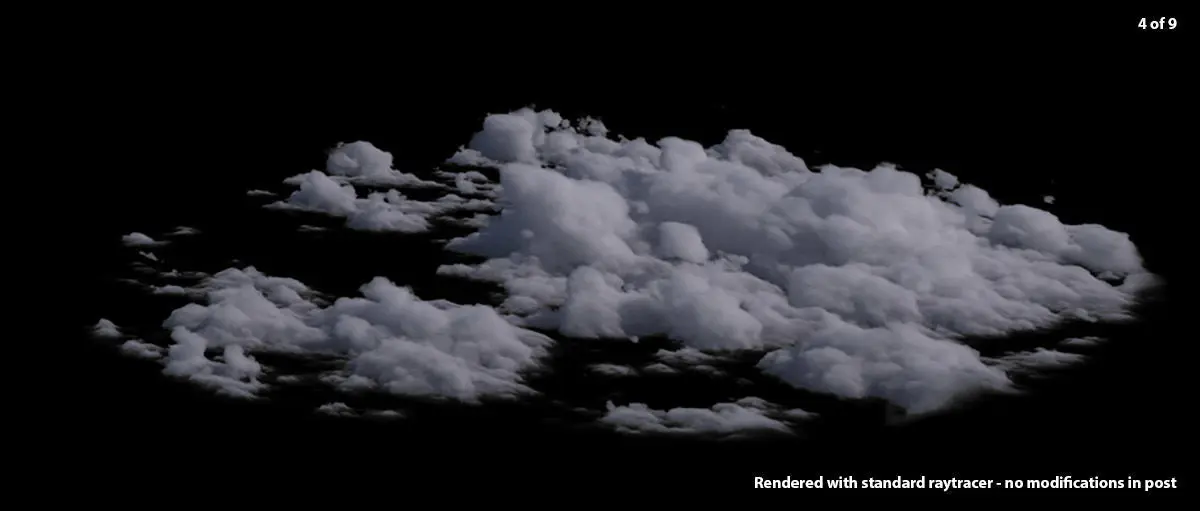 The examples, not including the marketing example, are straight renders. These were rendered in a standard raytracer, as were the clouds in the marketing image.