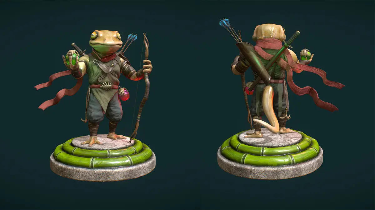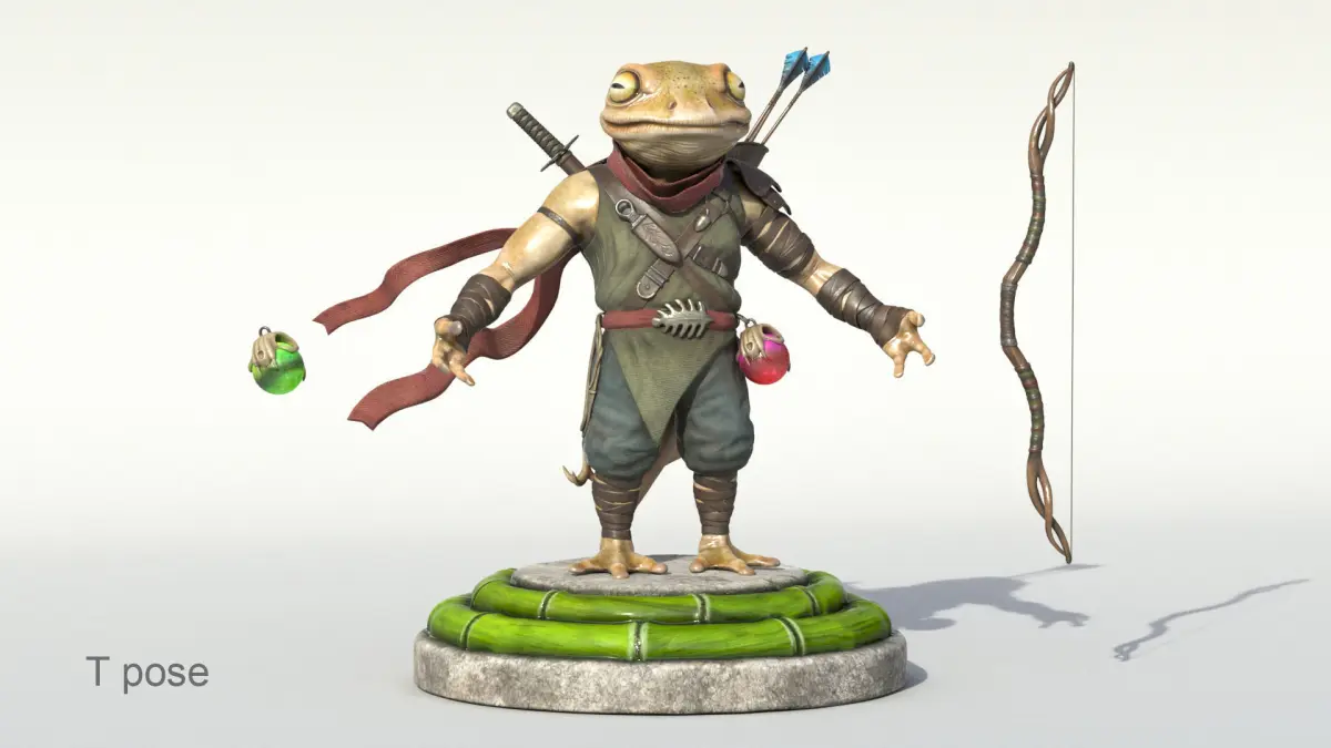 Low poly fiction ninja toad composed by 2 separate objects formed mainly by quads: Ninja toad (126441 polys), and the base (22473 polys). The assets are centered and with real wold measures (Toad size 1,6 m) and all made mainly with quads and have non-overlapping uvs. It is included two version, one of them in the final pose and other version in T pose (with the arms opened) in order to get rigged by the user. At the same time is included the hd versions of T pose with its base.The textures are PBR maps in 4096 x 4096 px (base color, normal map, roughness, metallic, ambient occlusion, emission light, glossiness and specular map) the base has: (base color , glosiness, ambient occlusion, metallic, roughness, glossiness and specular, all in 2024 x 2024). Its is included vray materials in the native files base toad vray.max and base toad T pose.max. This pack contains obj, fbx, max(2020) vray and max 2020 Scanline renderer, all of them in normal pose and T pose. It is ready to use in broadcast, advertising, design visualization, real-time, video game etc... It is non included HDRI map, the file ca be downloaded for free in: https://polyhaven.com/a/tiber_islandThe images were rendered with vray with vray materials included in the pack.