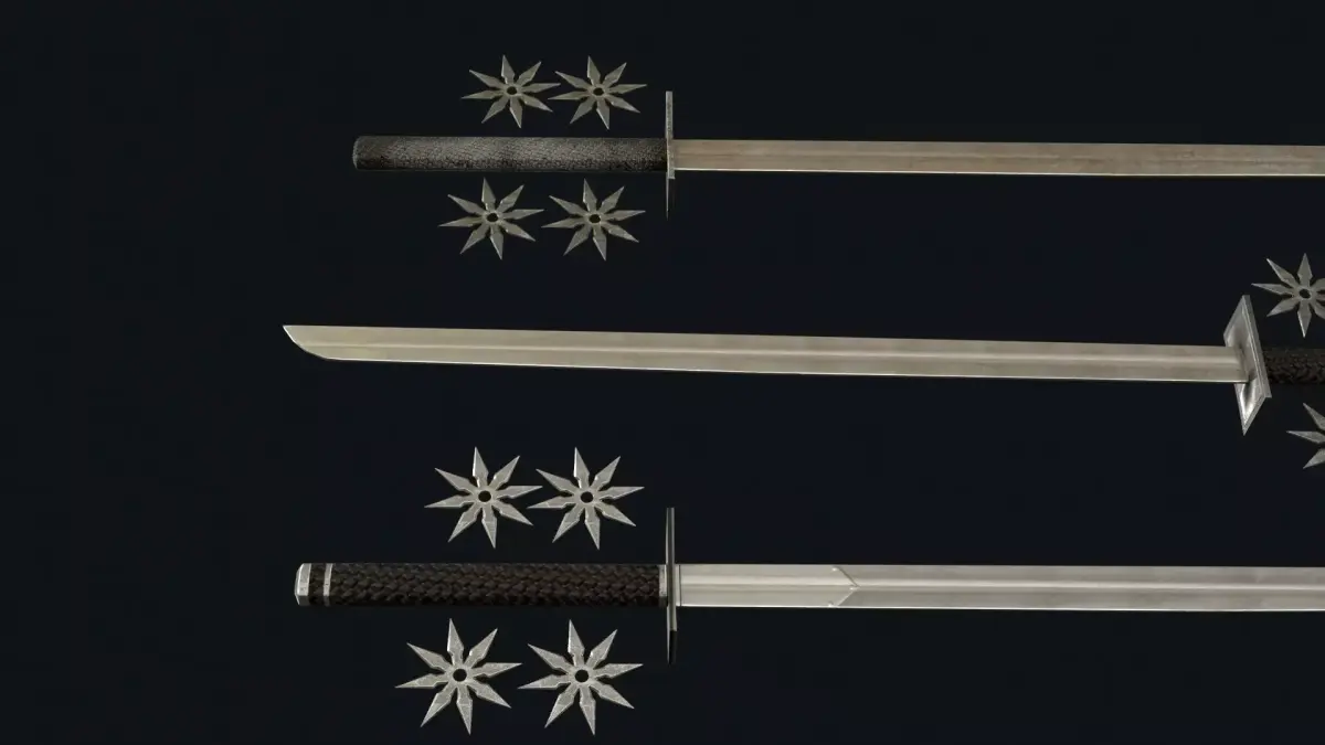 The set includes a katana and shuriken, offering a versatile selection of melee and throwing weapons for different combat styles and character builds. Each model features PBR textures and is prepared for easy integration into game engines. The handles and pivot points are positioned for convenient placement and attachment, and the models are oriented along the Z axis. The asset includes 2K and 4K textures, making it suitable for optimized real-time use as well as more detailed cinematic scenes.