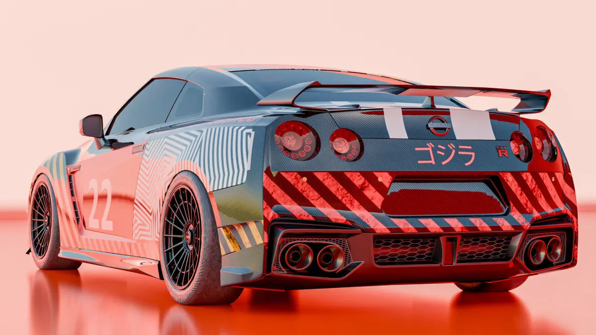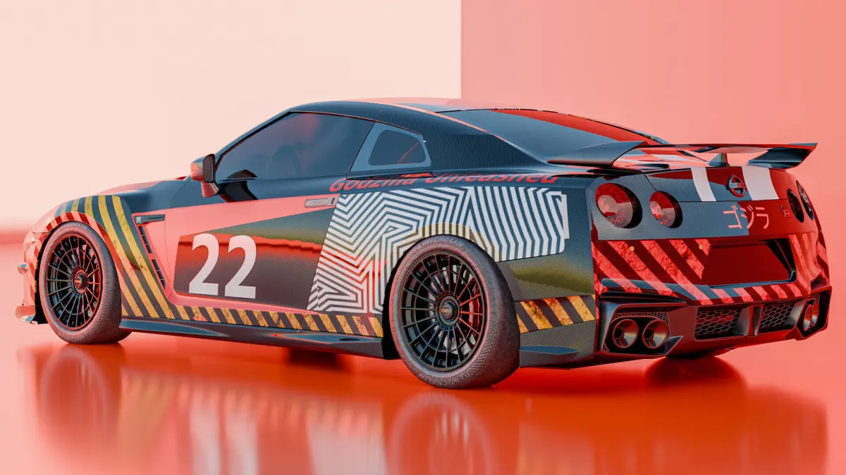 3D Base & Car Setup in BlenderModel Preparation:Using a clean base mesh of the Nissan GT-R, I set up a presentation-ready model with subdivision surfaces and clean topology to ensure the livery would wrap seamlessly without distortions.