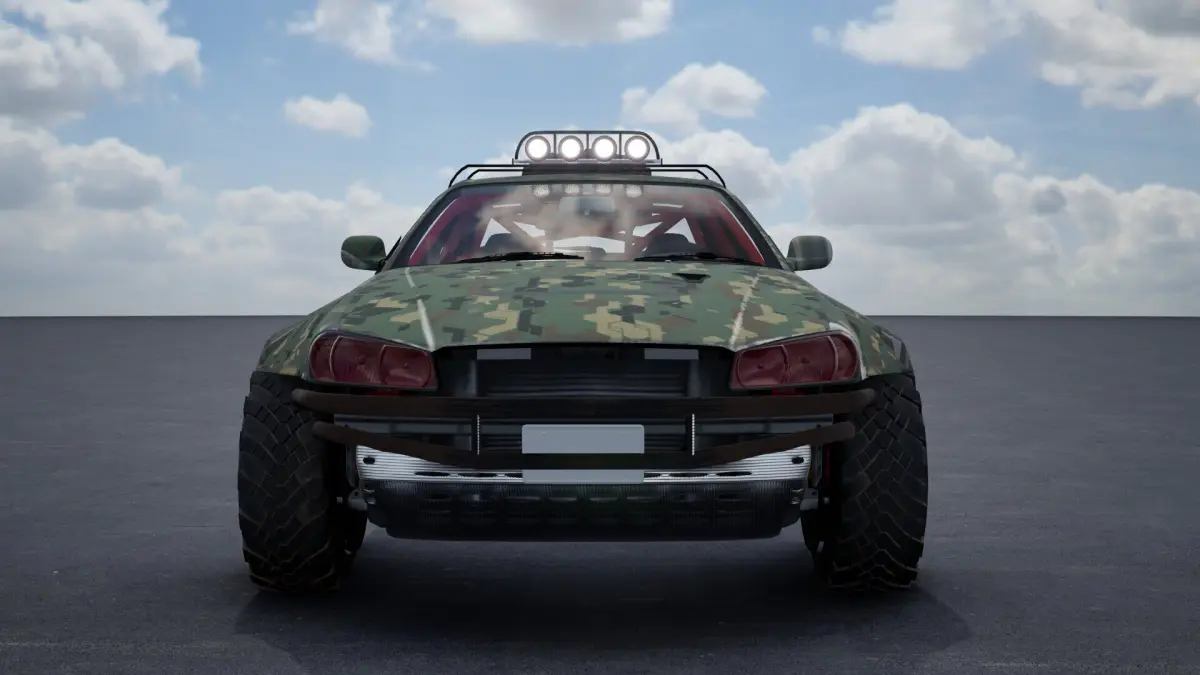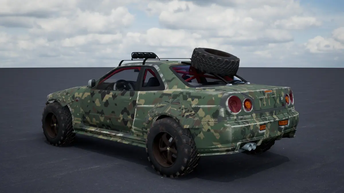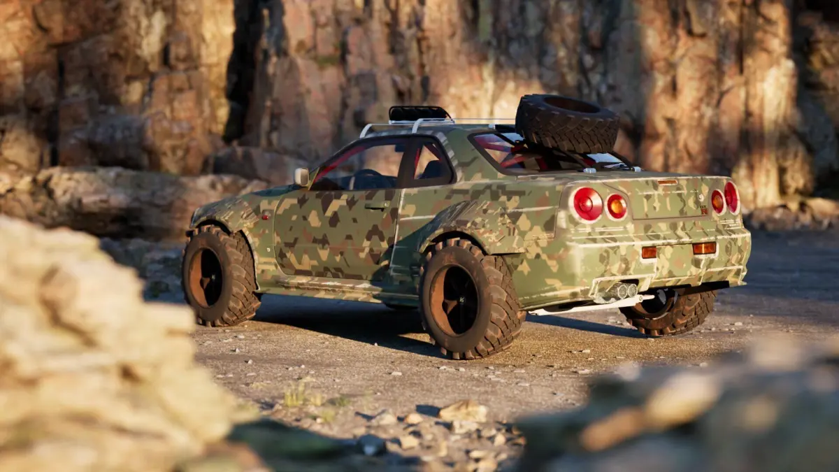 Present the legendary elegance and power of the Nissan R34 in a high-quality 3D model, enhanced with a subtle, elegant camo design. This model is crafted for creators who desire the perfect blend of classic and modern style.