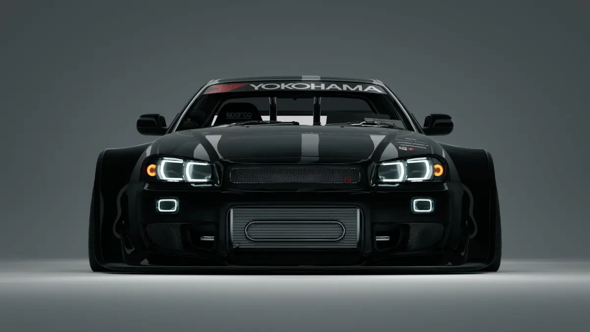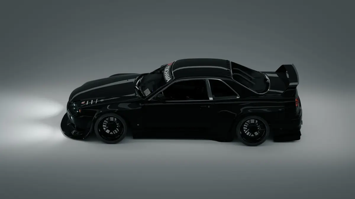 Nissan R34 Skyline with large widebody fender flare kit.This model has Intimidating xenon lighting kit, slammed suspension, cambered extremely high quality wheels, incredibly detailed interior, titanium polished steering wheel, nitrous tanks, detailed twin turbo RB 26 swapped engine, low profile spoiler, front exposed intercooler, branding logo liveries, branded sunstrip, roof vortex generators, classic GT-R logo on a custom grill.