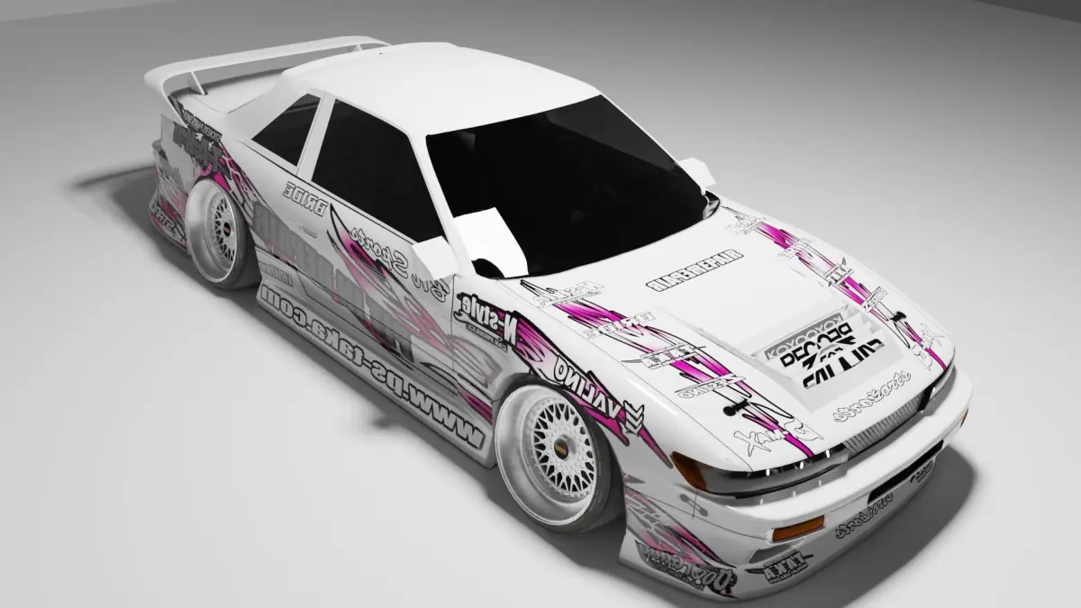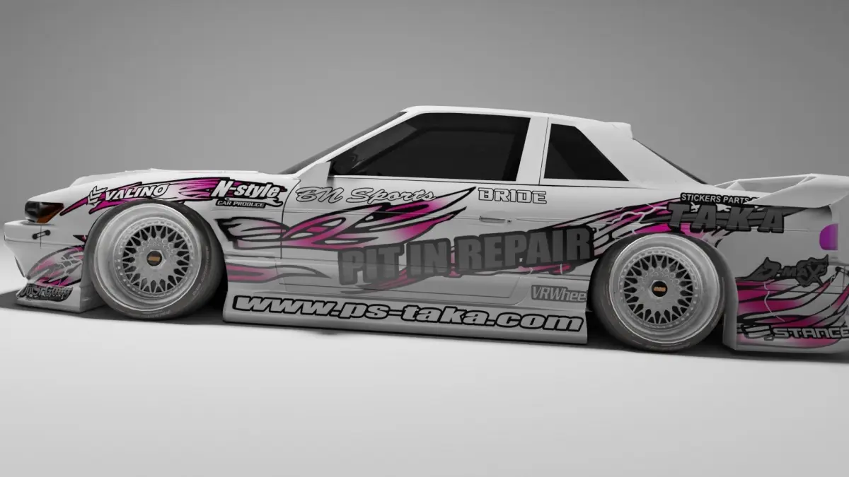 High poly nice looking S13 with BNSport body kit and Pit In Repair liveryPolygons: 4,189,920 mil (Body, Interior and wheels)Vertices: 2,120,404 mil (Body, Interior and wheels)All textures include in *.zip fileIf you want to rig this car, rotate wheels for 9.1 or -9.1 degrees for correct rotation