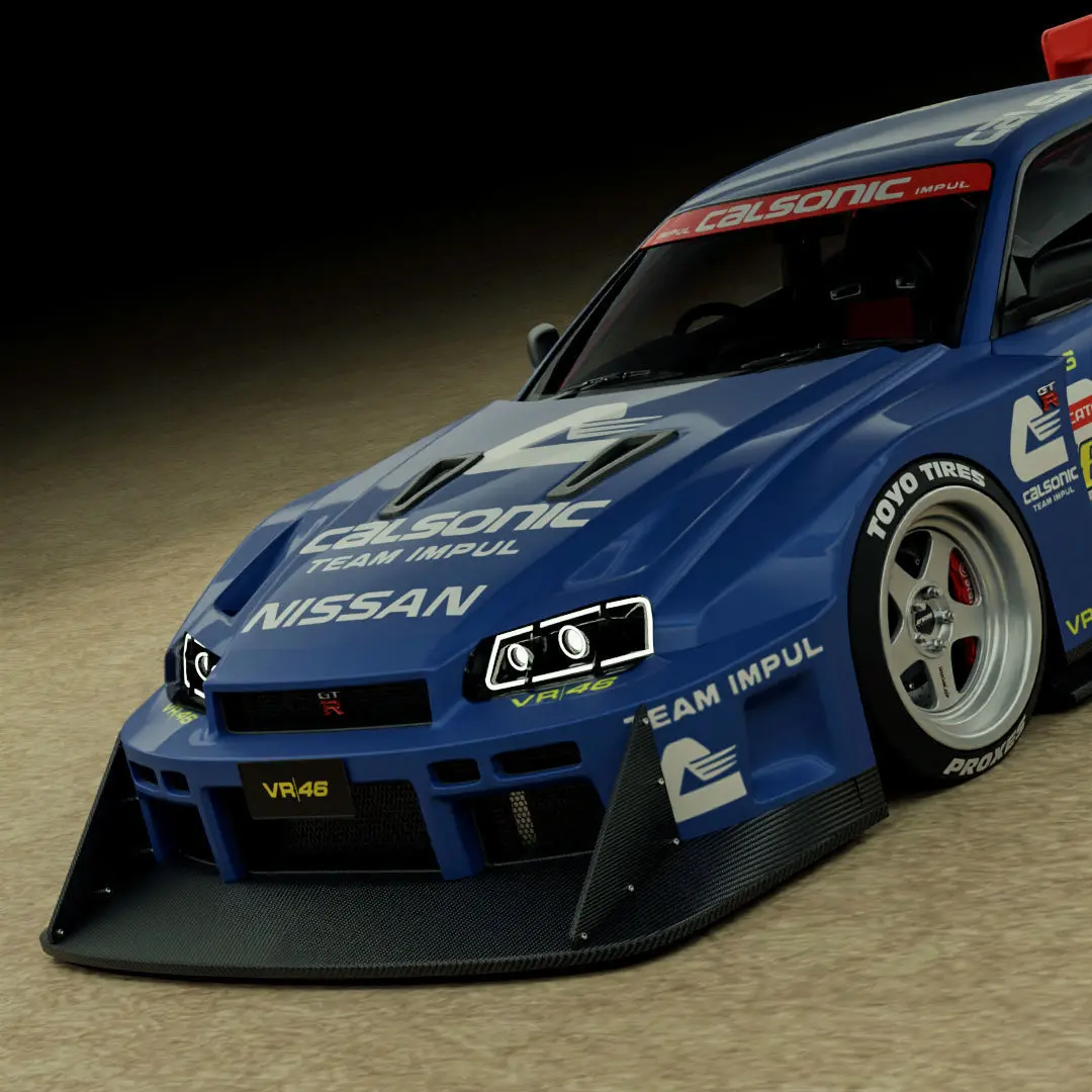 A special edition of the iconic Japanese livery and bodykitHere is Nissan Skyline R34 Calsonic Livery from the iconic race car from NIssanWith LBWK body kit and big wing in the rear also include Nissan GTR Engine inside the hood