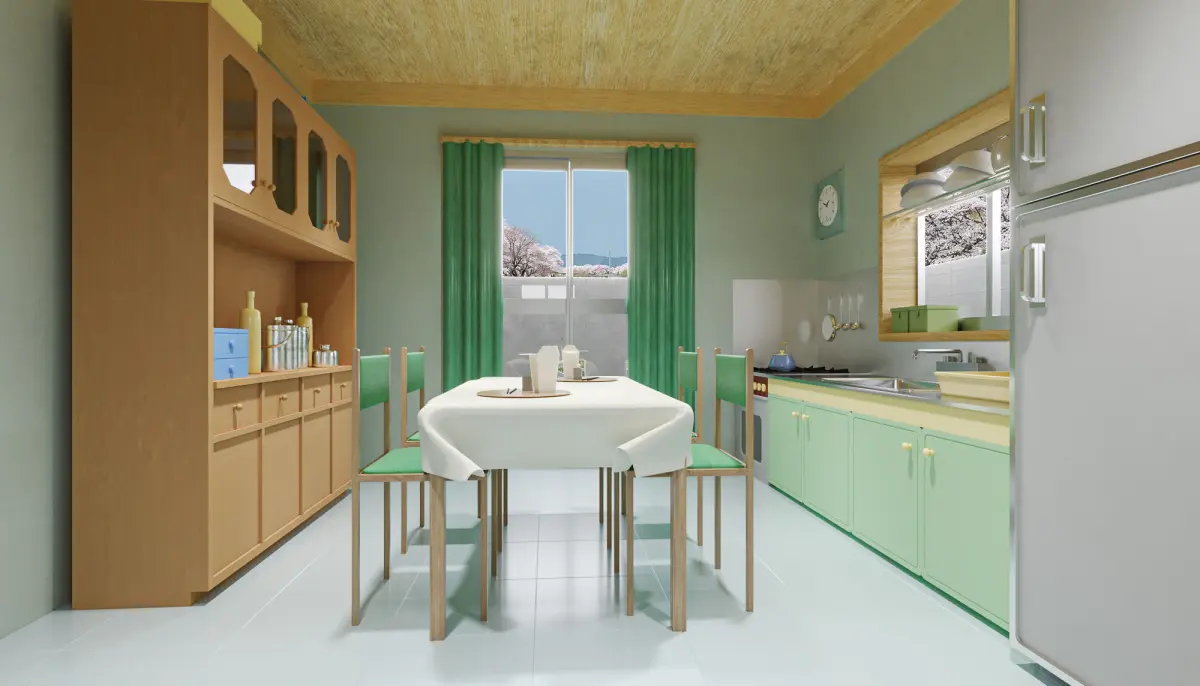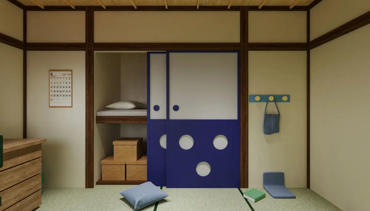 It is the home of the popular 90's anime Nobi Family.Created with 3D's Max. Pictured with Corona.They are simple cartoon models created from boxes.While creating the exterior and interior, their positions in the anime series were taken into account.