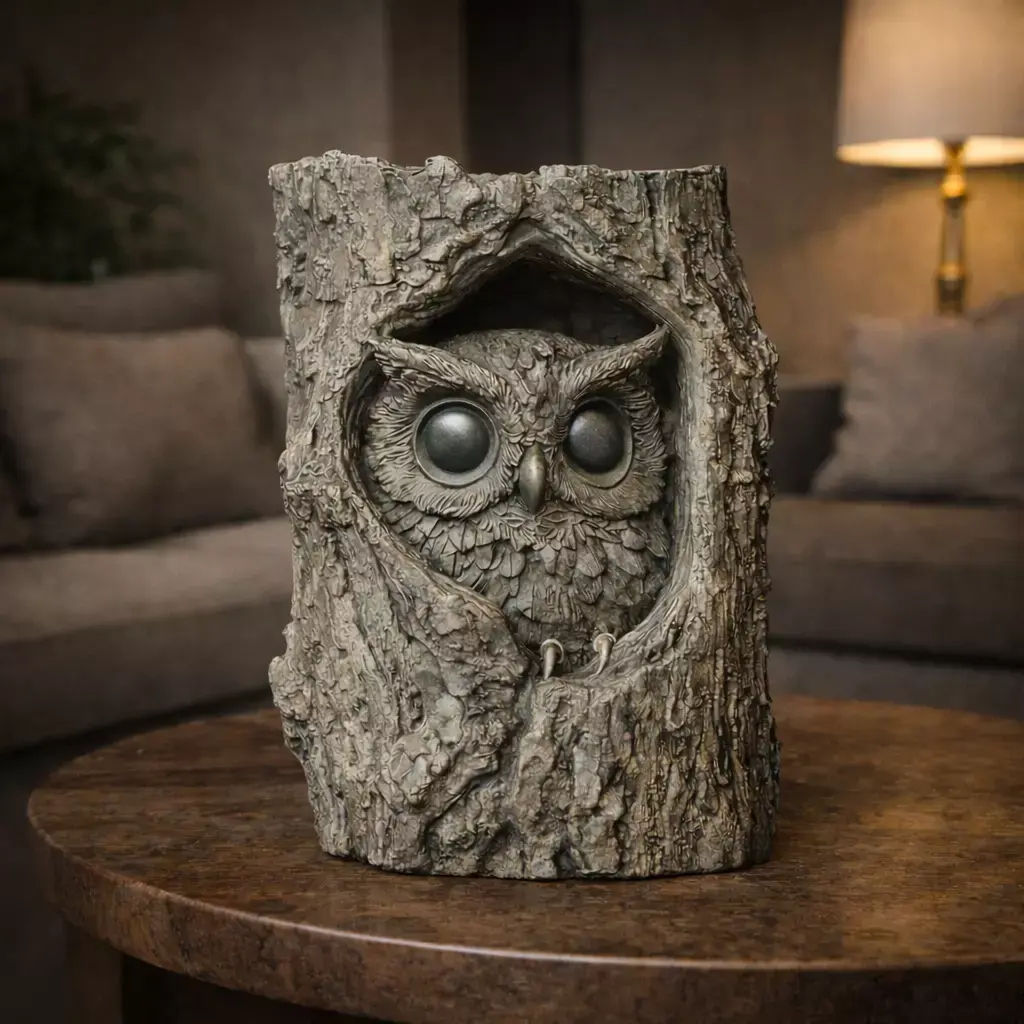 The design features an owl emerging from a hollow tree trunk, finished in an aged patina stone style, making it ideal for premium interior decor and architectural visualization.