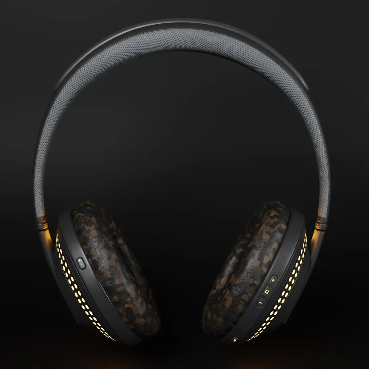 Fictional Hi-Fi noise-cancelling headphones with colored LED ringsConnectivity: both wireless (bluetooth) and wired (3.5 mm jack)