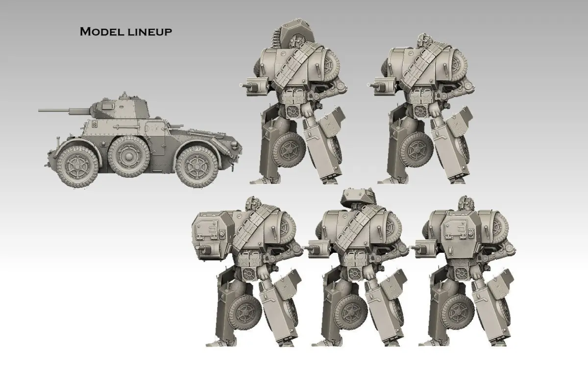 Robot made to resemble the style of the Transformers franchise. The robots cannot transform (they are monopose .stls). Included in the model pack is also an armored car, representing the vehicle mode of the robots.There are 5 variants of the robot included in the model pack. They share the same pose, but the constituent parts are arranged differently on each variant. See image gallery for the model lineup.Finally, there is also 1 rectangular base included.