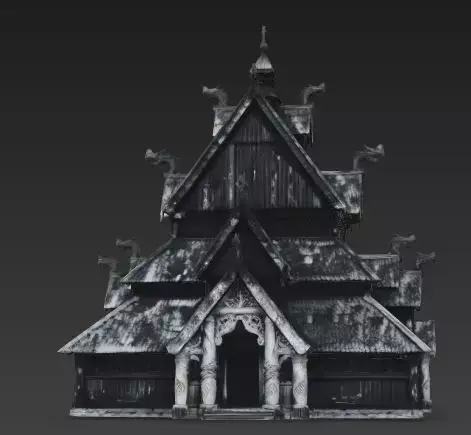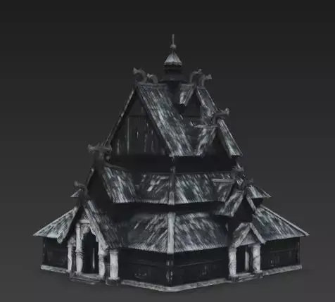 The Overall Concept This is a masterpiece of ancient Scandinavian architecture. It represents a Stave Church, a wooden structure common in the Viking Age and early medieval Norway. It is perfect for a Viking village, a snowy mountain pass, or a historic Nordic setting.