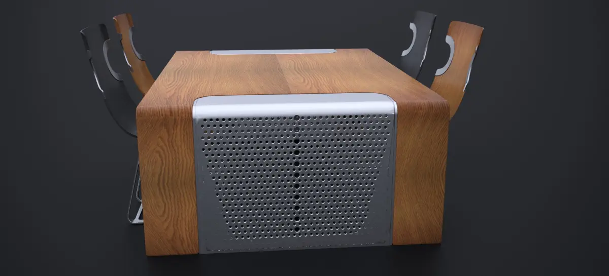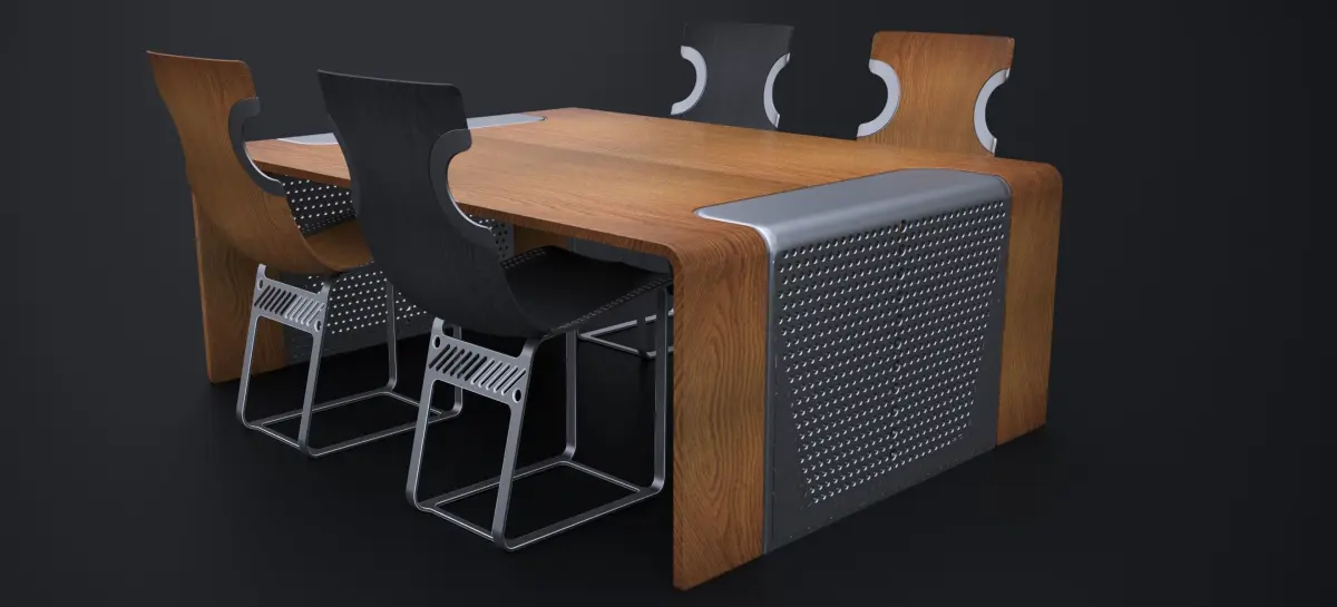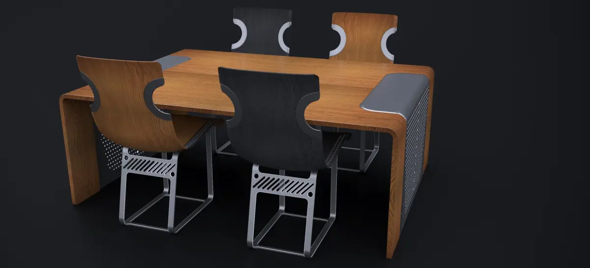 PRODUCT BRIEF DESCRIPTION: "A complete concept dining room set I did for European living style with modern blend of sustainable timber and recyle aluminum. The table is form using high vaporization thermal heating and the decorative aluminum side panels are machine and heat forming.