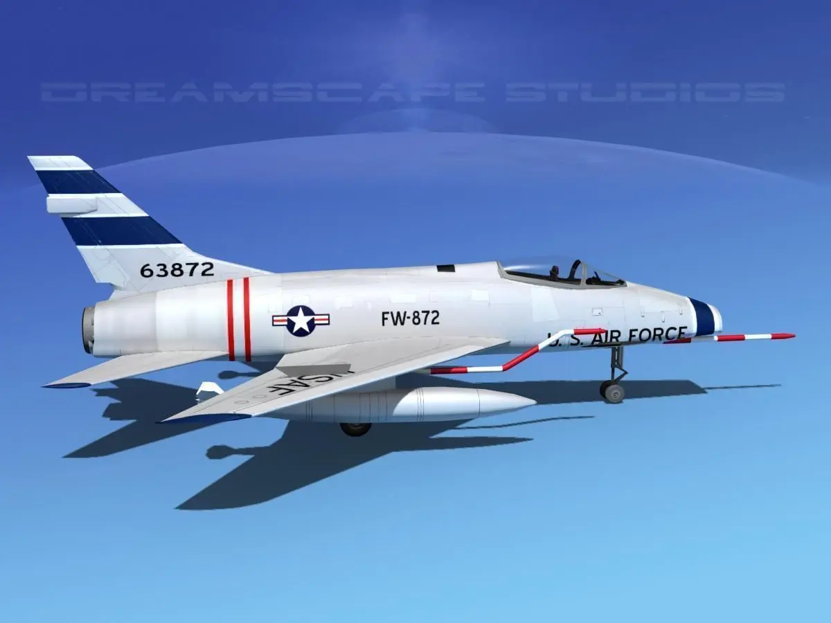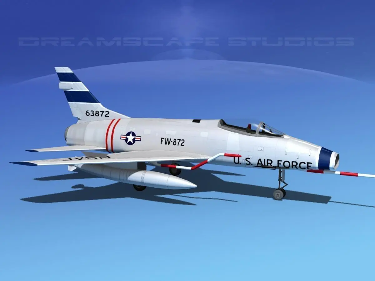The North American F-100 Super Sabre was an American supersonic jet fighter aircraft that served with the US Air Force (USAF) from 1954 to 1971 and with the Air National Guard (ANG) until 1979.F-100D is single-seat fighter-bomber, more advanced avionics, larger wing and tail fin, landing flaps. It saw service in Vietnam as a low level bomber in support of ground forces. F-100F is two-seat training version, armament decreased from four to two cannon.