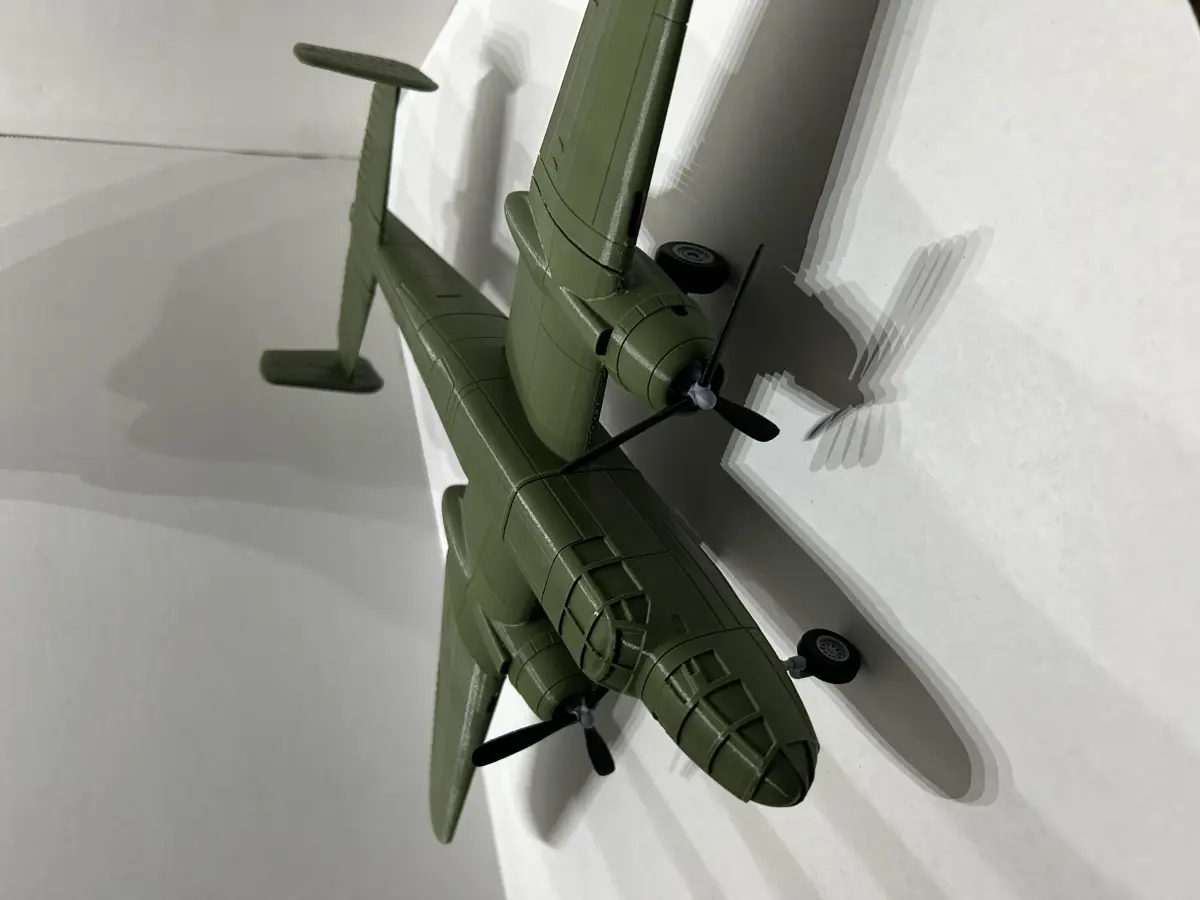 This is a simple 3D print model kit. The design is inspired by a twin-engine, medium-wing monoplane medium bomber aircraft, developed by the US aeronautical company North American Aviation in the late 1930s and used mainly by the United States Army Air Forces (USAAF) during World War II and considered as one of the best medium bombers of the conflict. The official designation incorporated the name Mitchell in honor of General Billy Mitchell, one of the first major advocates of using air power for military purposes.