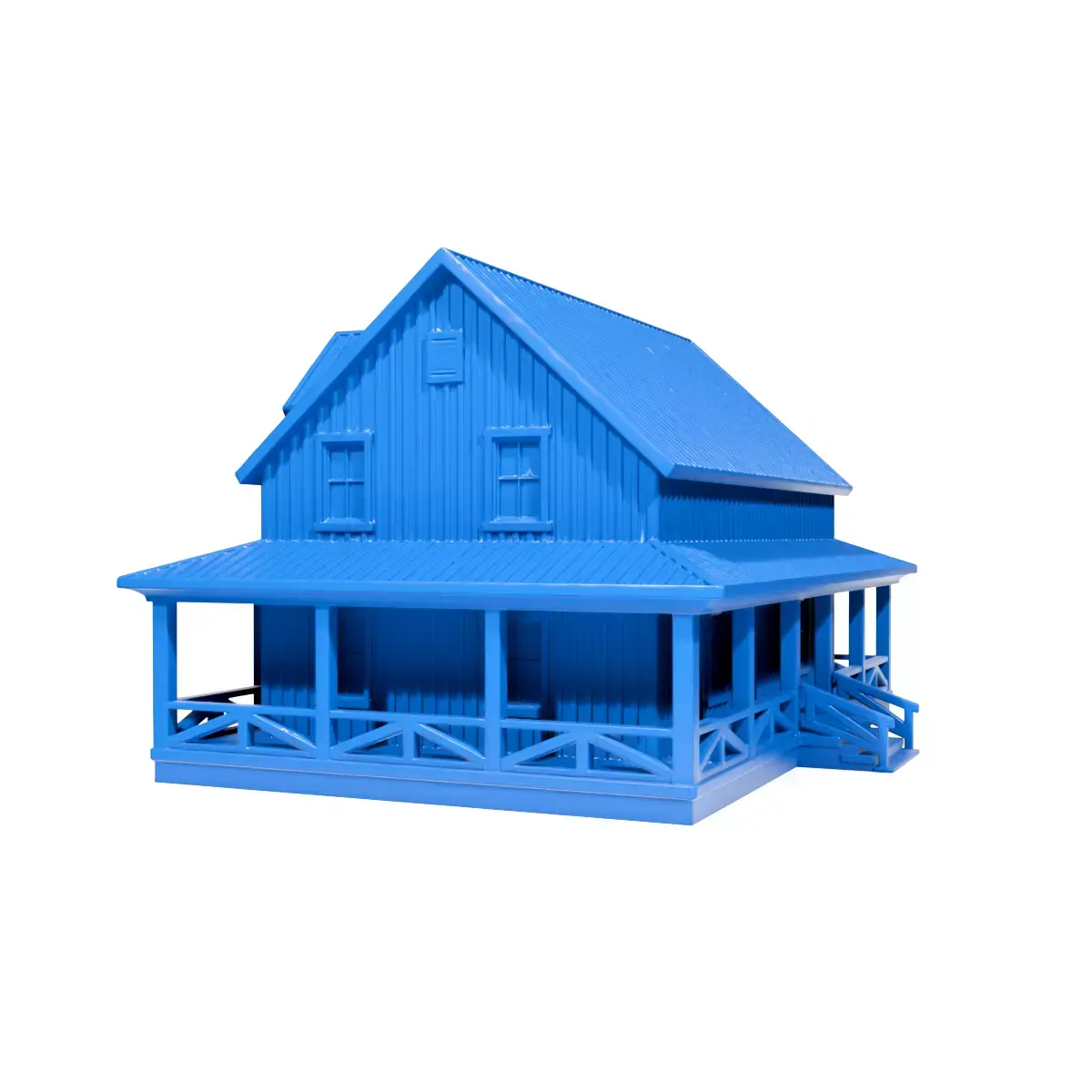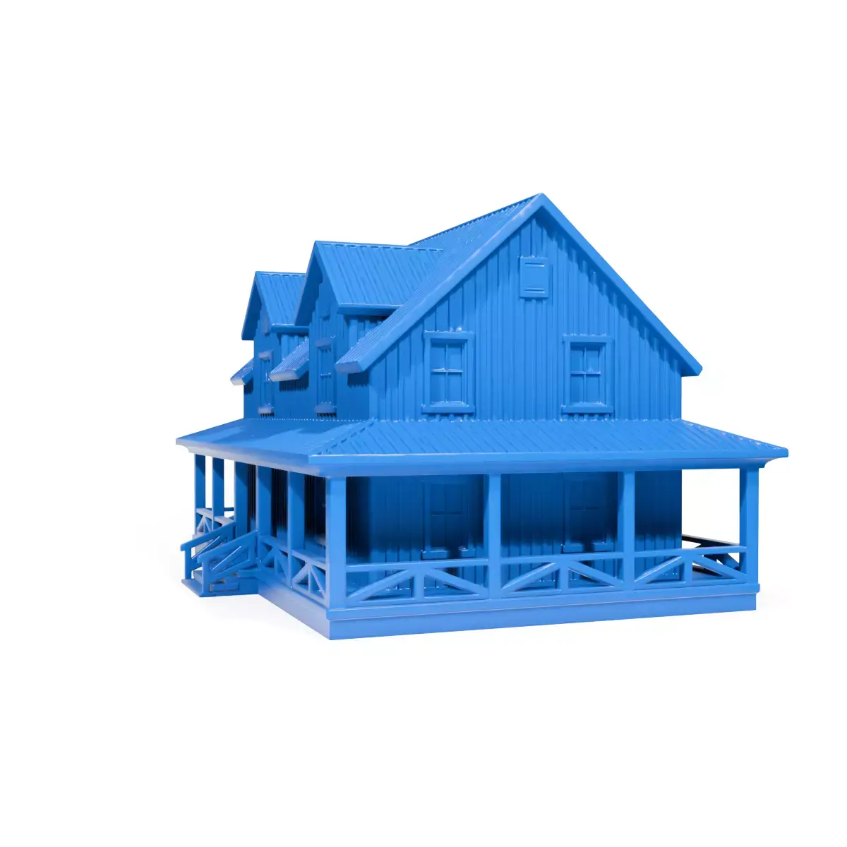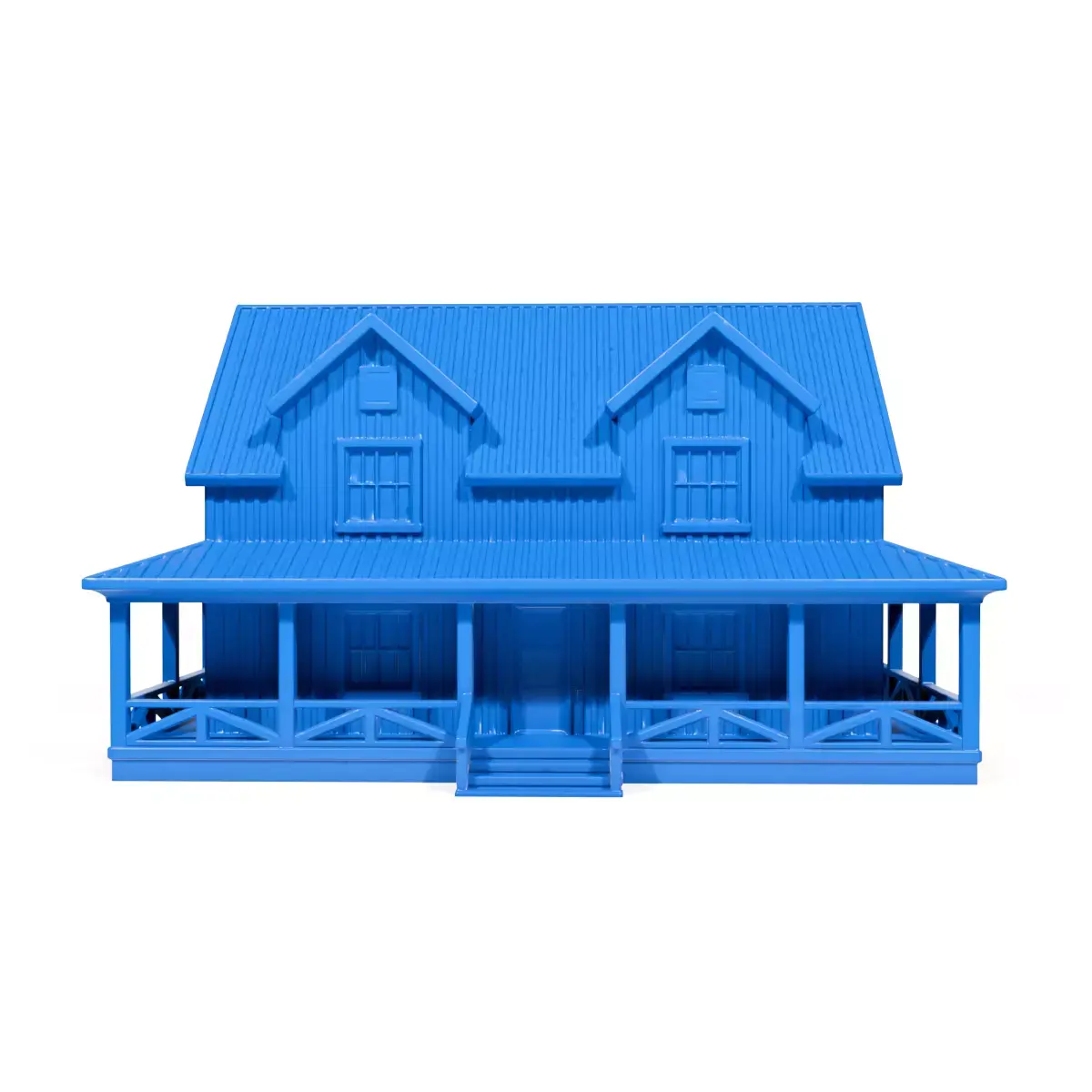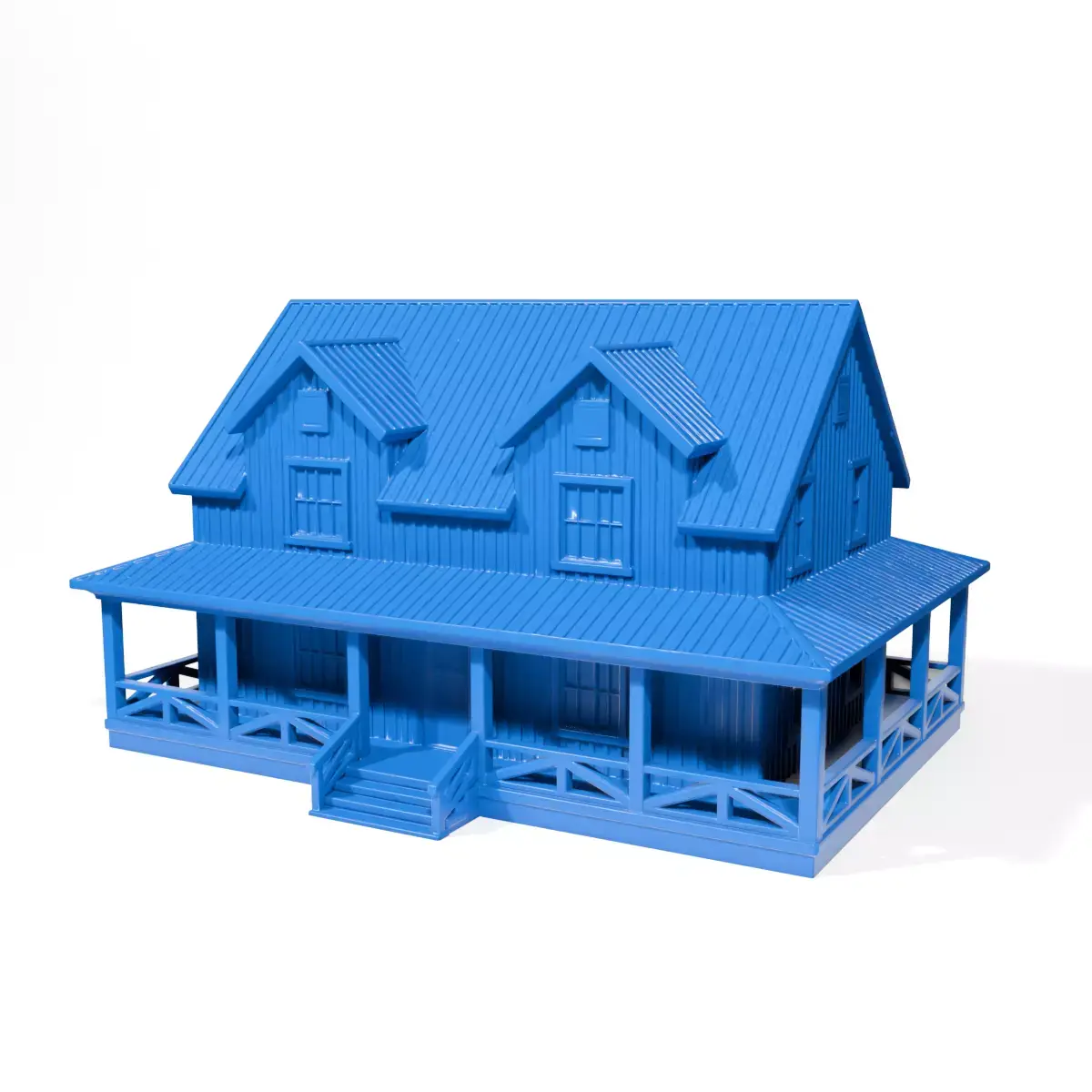 The North American house model features a classic architectural design with intricate details reminiscent of traditional American homes. The model includes features such as a wraparound porch, multiple dormer windows, and detailed wood paneling to capture the essence of North American domestic architecture.