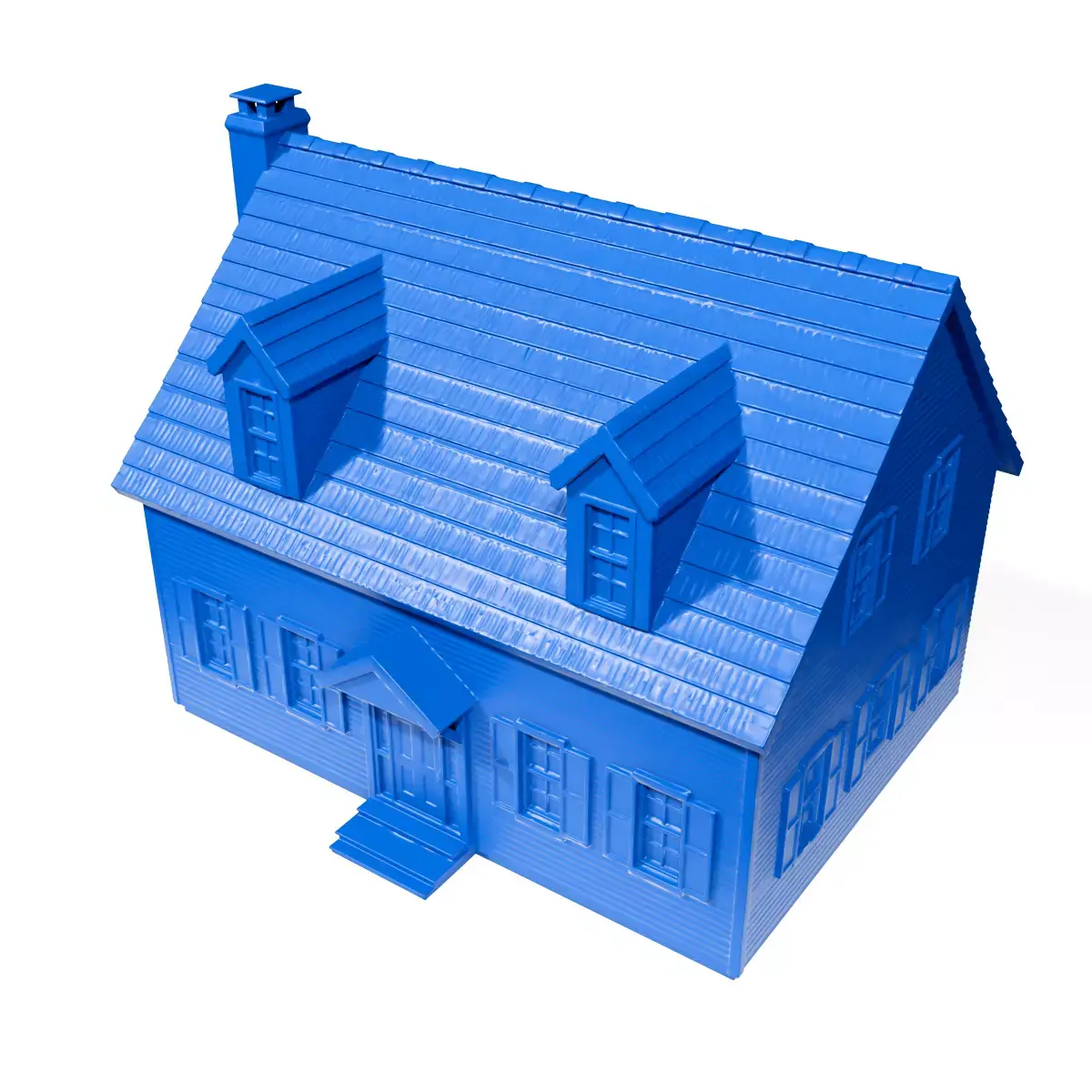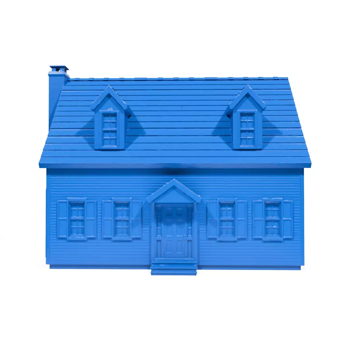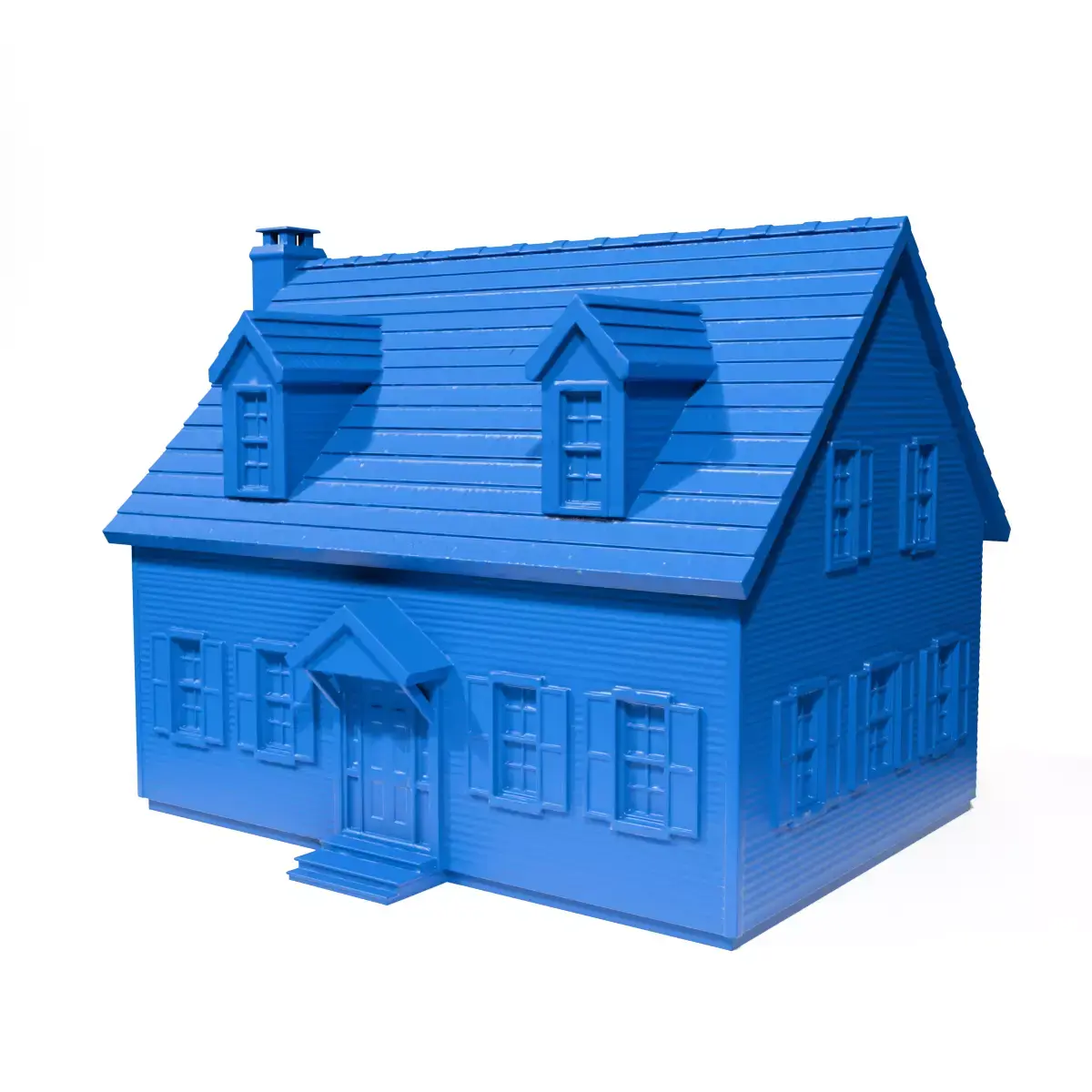 This model of a North American house features typical architectural elements found in suburban neighborhoods, highlighting features like dormer windows and a pitched roof.