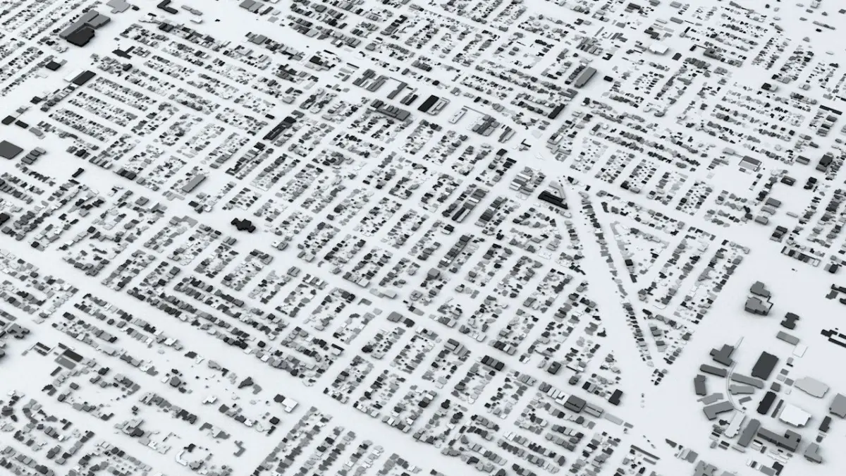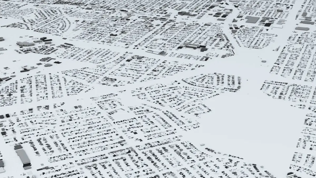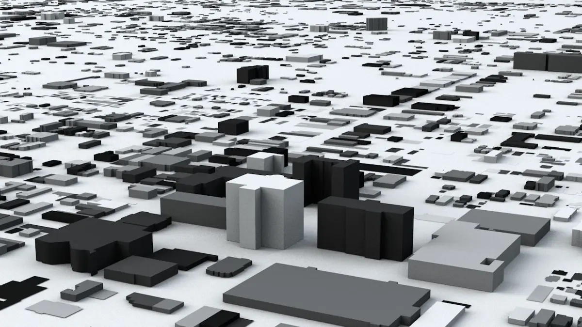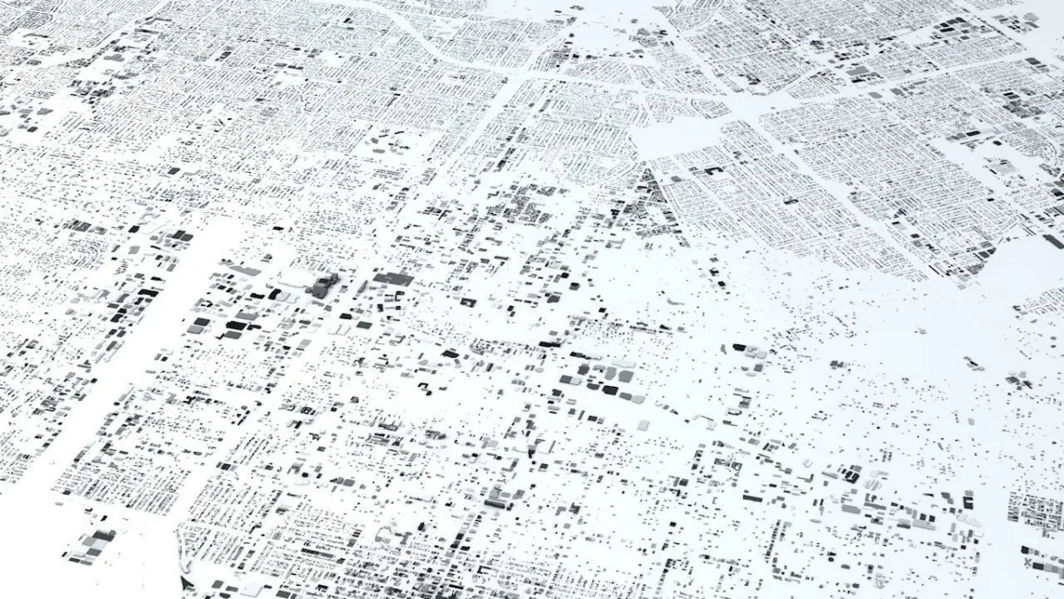 - the model is positioned on a flat surface (all buildings are on the “floor” - no elevation data included)