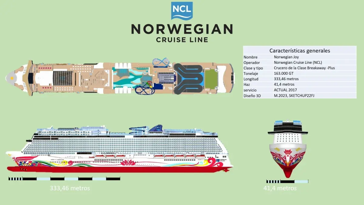 El Norwegian Joy Contiene:-THE MANHATTAN ROOM-DECK 7 LIFEBOAT-DECK 8 WATERFRONT (THE DISTRICT BREW HOUSE, FOOD REPUBLIC, LA CUCINA ITALIANA, OCEAN BLUE, THE CAVER CLUB, CEGNEYS & LE BISTRO)-CABINA DE CONTROL -OBSERVATION LOUGE-GRANDE CAFE-POOL DECK -KIDS AQUA PARK-OCEAN LOOPS-HORIZON LOUGE