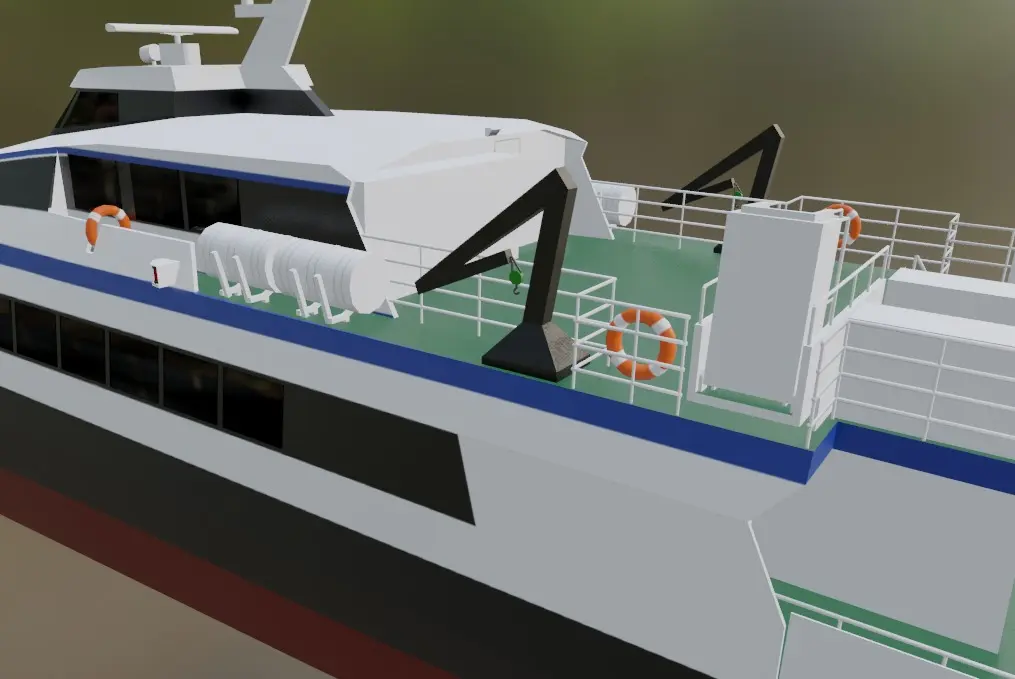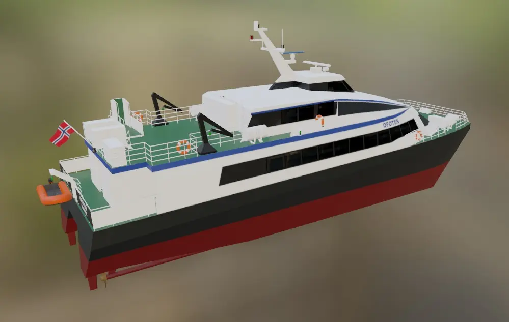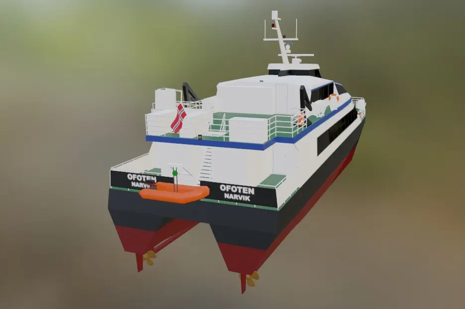 Norwegian Passenger Catamaran MS Ofoten in two different colours, blue as when operated by Torghatten AS and red as when operated by Ofotens Dampskibsselskab ASA.