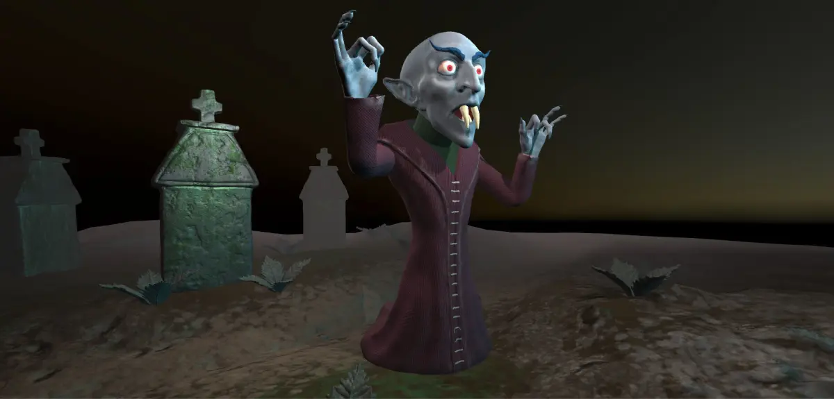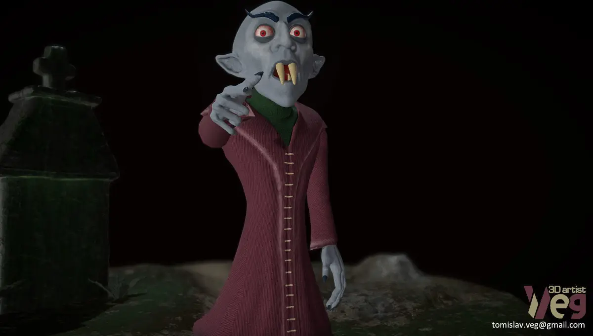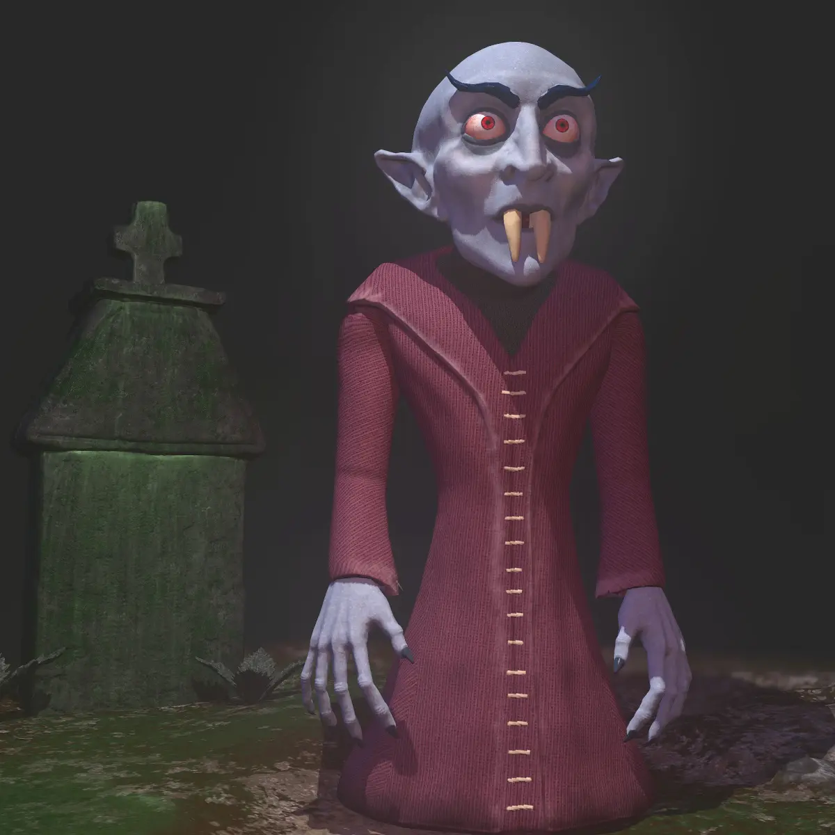 Caricature of Nosferatu (the vampire). Low poly, rigged PBR textured 3D character.