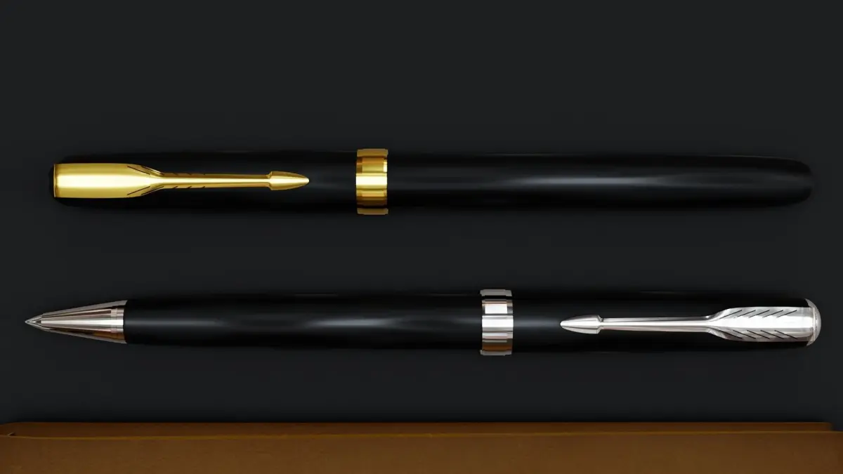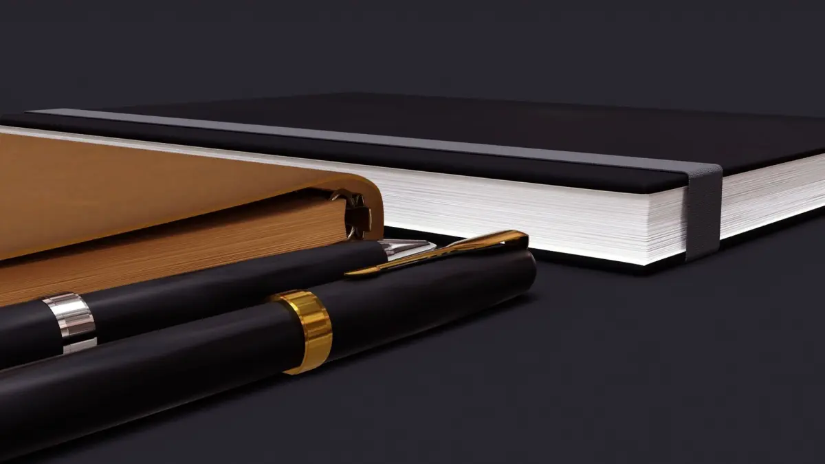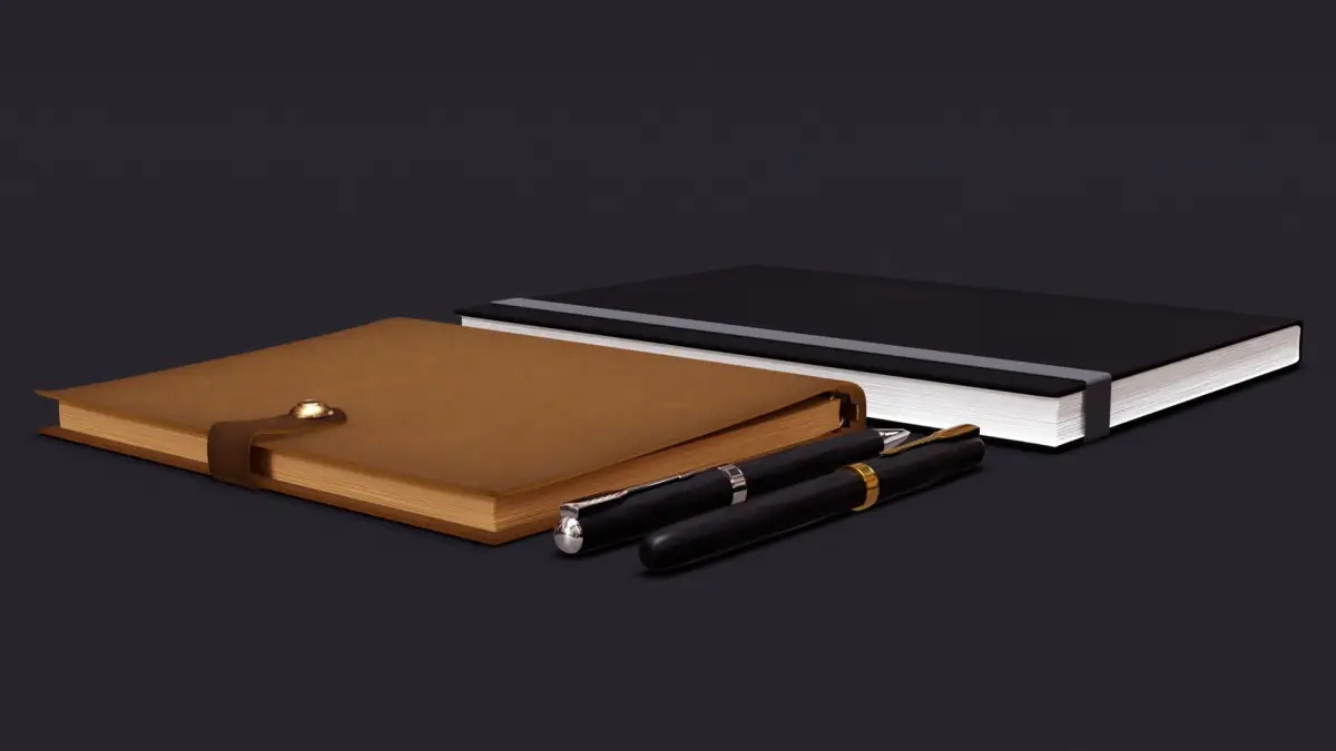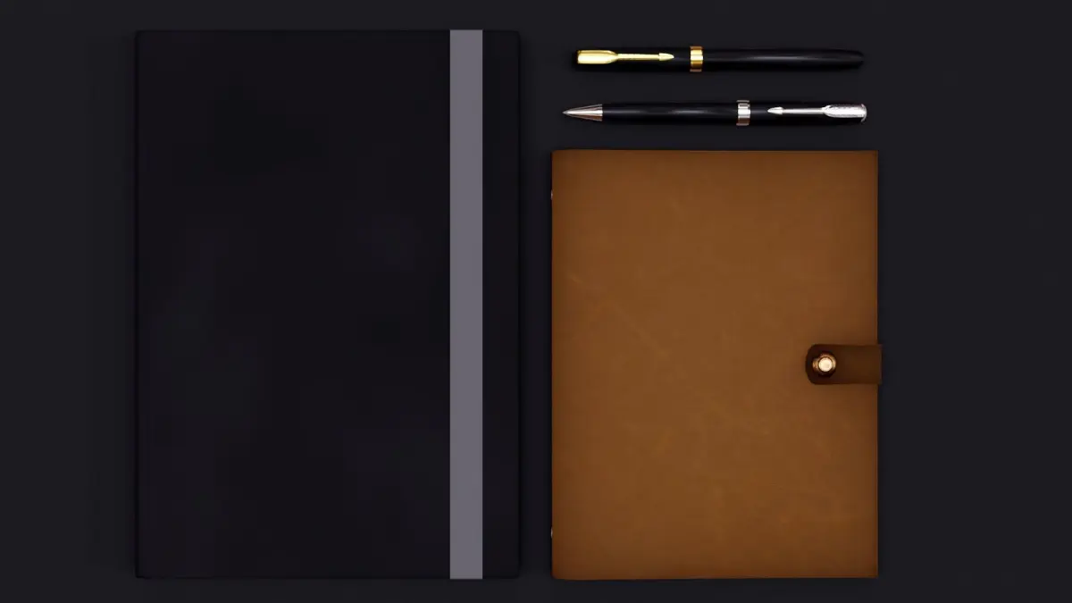 THIS MODEL CONTAINS:1 Black Copybook1 Leather Agenda1 Black and Silver pen1 Black and gold pen