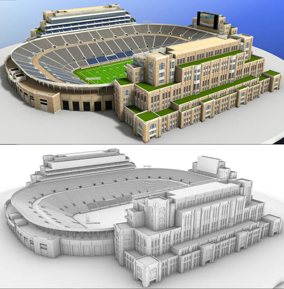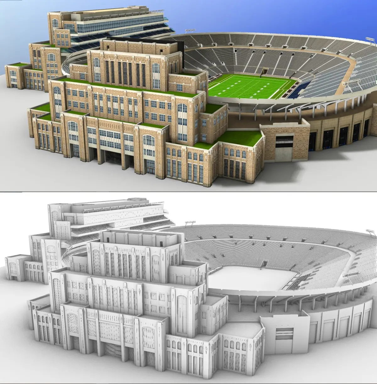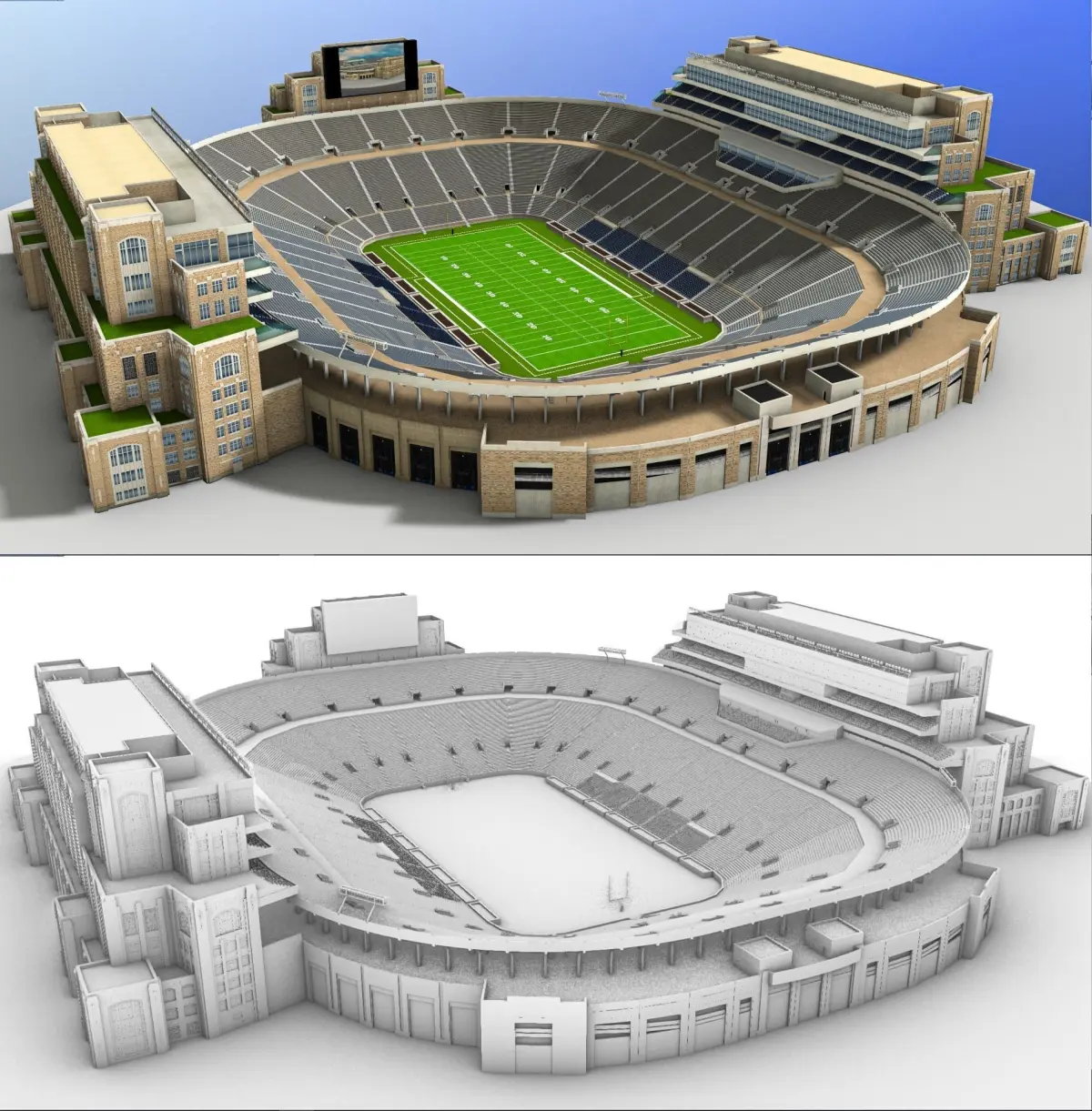 The 3D model is based on photos references of the real world Notre Dame Stadium, both, interior and exterior. It was created with approximate dimensions.