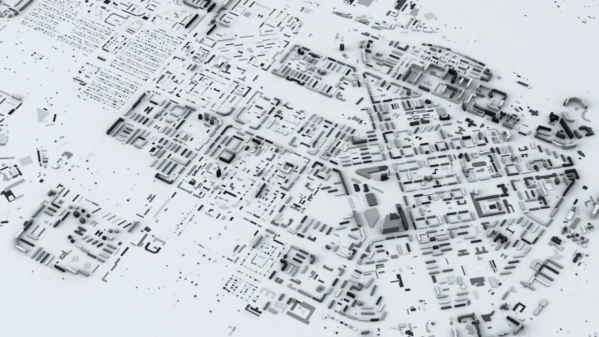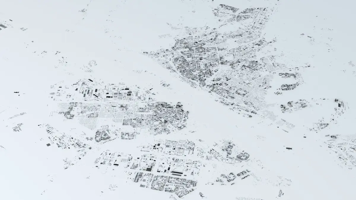 - the model is positioned on a flatv surface (all buildings are on the “floor” - no elevation data included)v