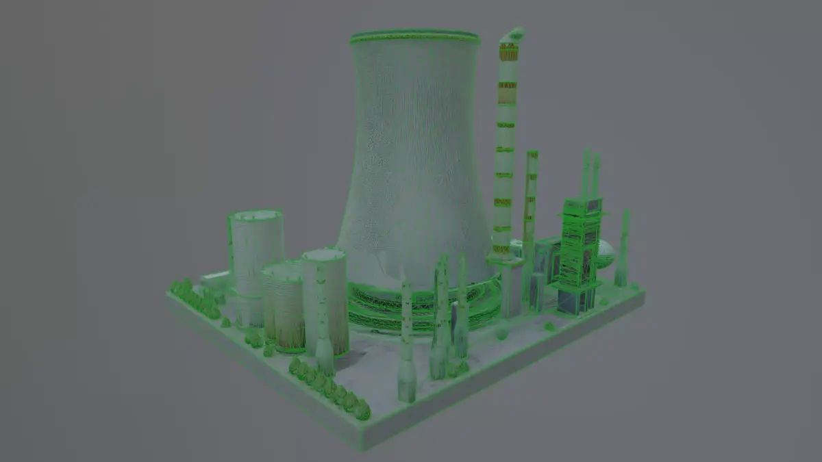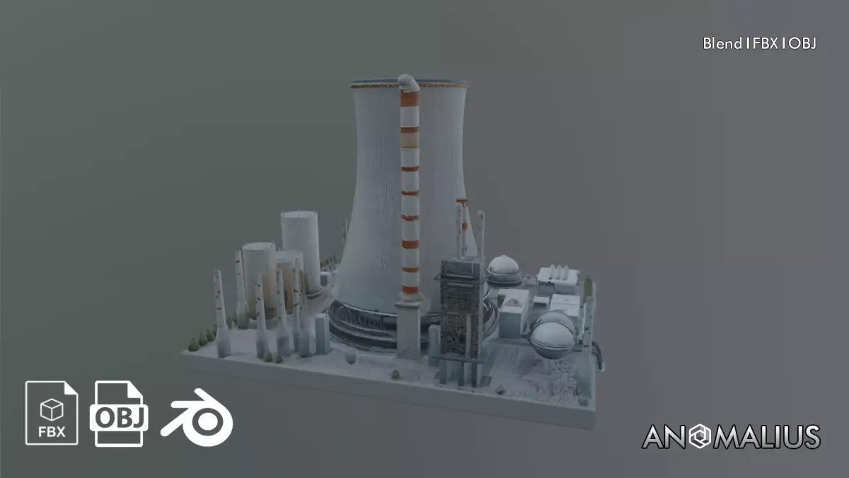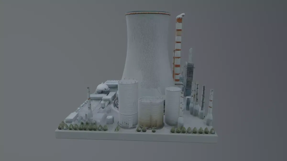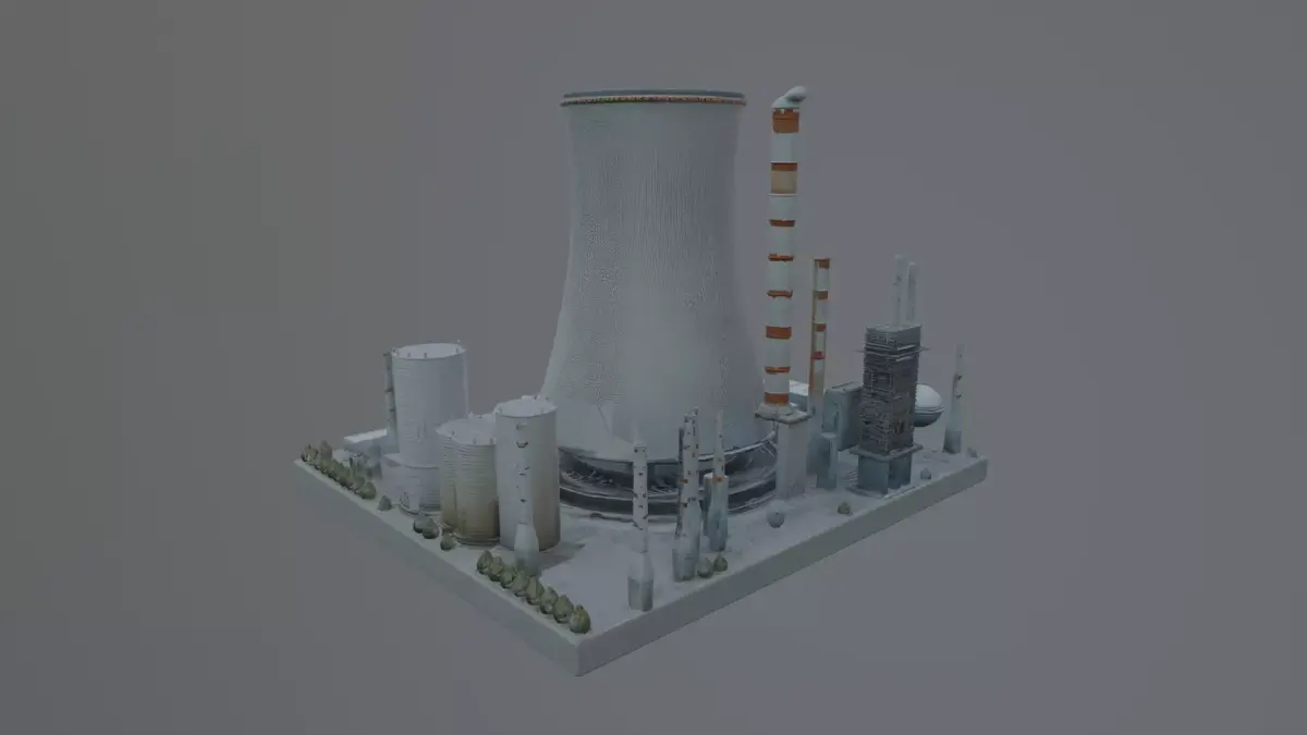 this Nuclear Reactor complex provides an imposing silhouette for any horizon. The model features a hyper-detailed cooling tower with realistic concrete weathering, alongside secondary reactor buildings, chimneys, and storage tanks