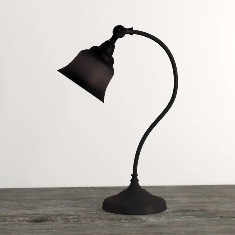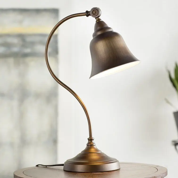 - Brimming with vintage inspiration, this 21" arched table lamp doubles as decor as it boosts the brightness in any space. Crafted from metal, this piece features a round base, a curved arm, and a bell-shaped shade in an antique copper finish that blends easily with most color palettes and aesthetics.