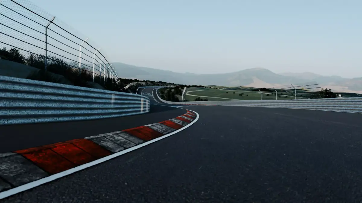 Highly detailed 3D model of a racing circuit environment, suitable for simulations, visualizations, animations, and concept scenes. The track includes a complete layout with realistic surface features, curbs, elevation changes, and surrounding landscape.