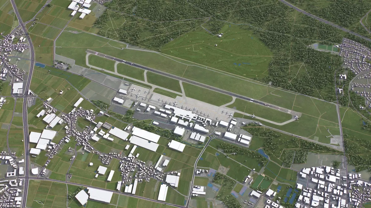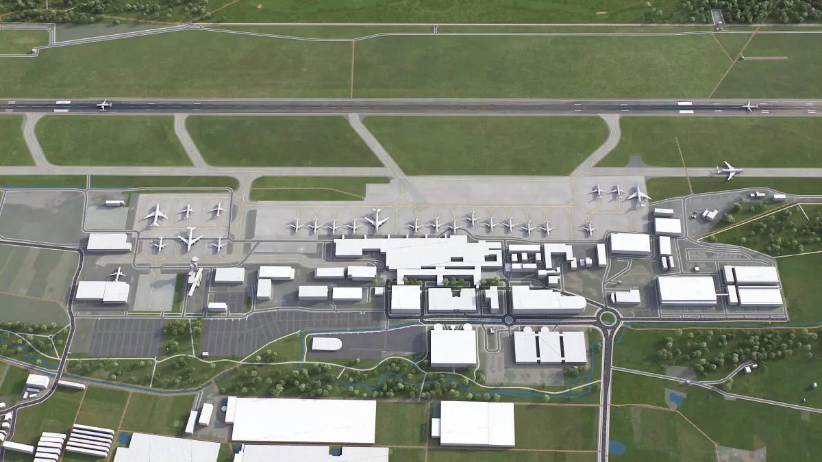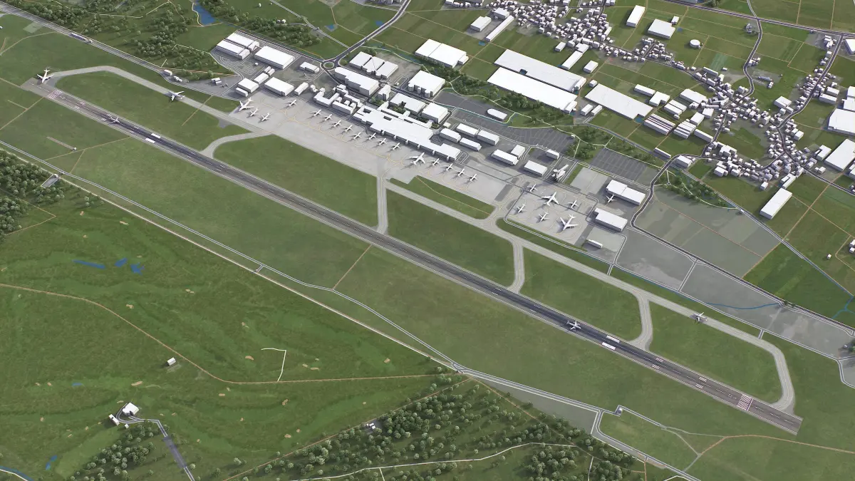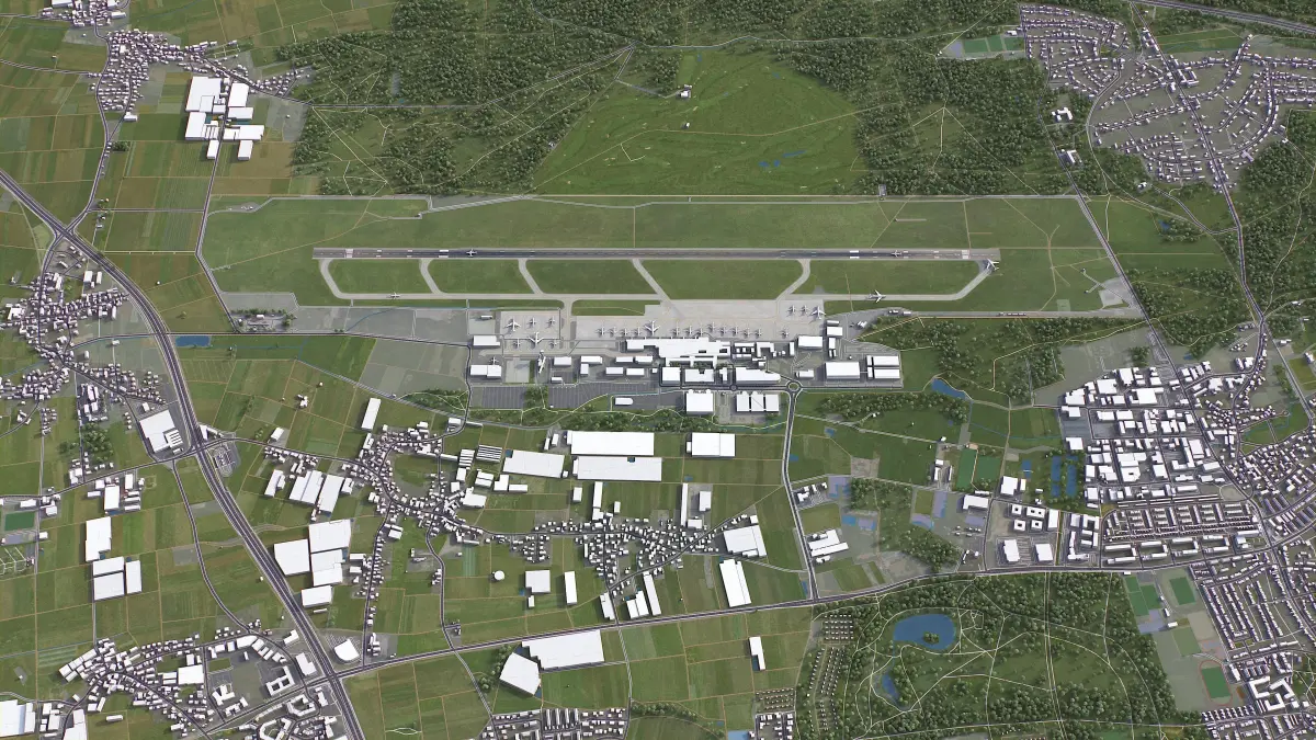 This is exact and accurate to-scale 3D model of Nuremberg Airport and its surrounding area based on GIS data (April 2022)