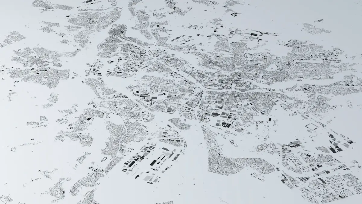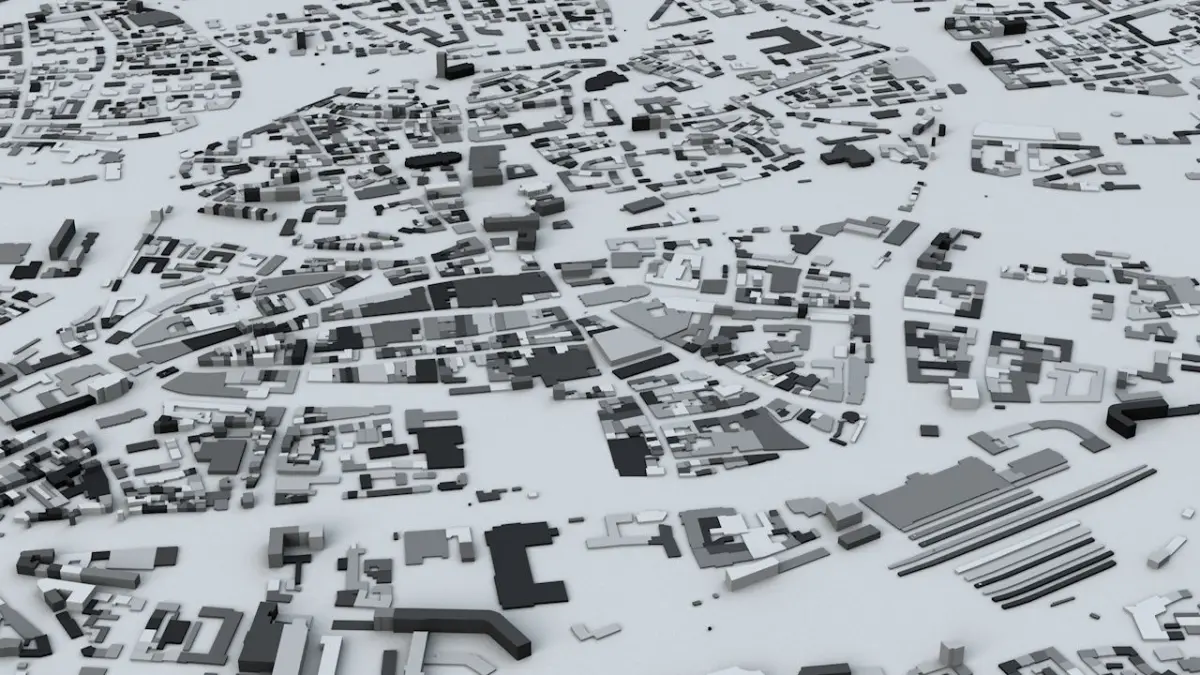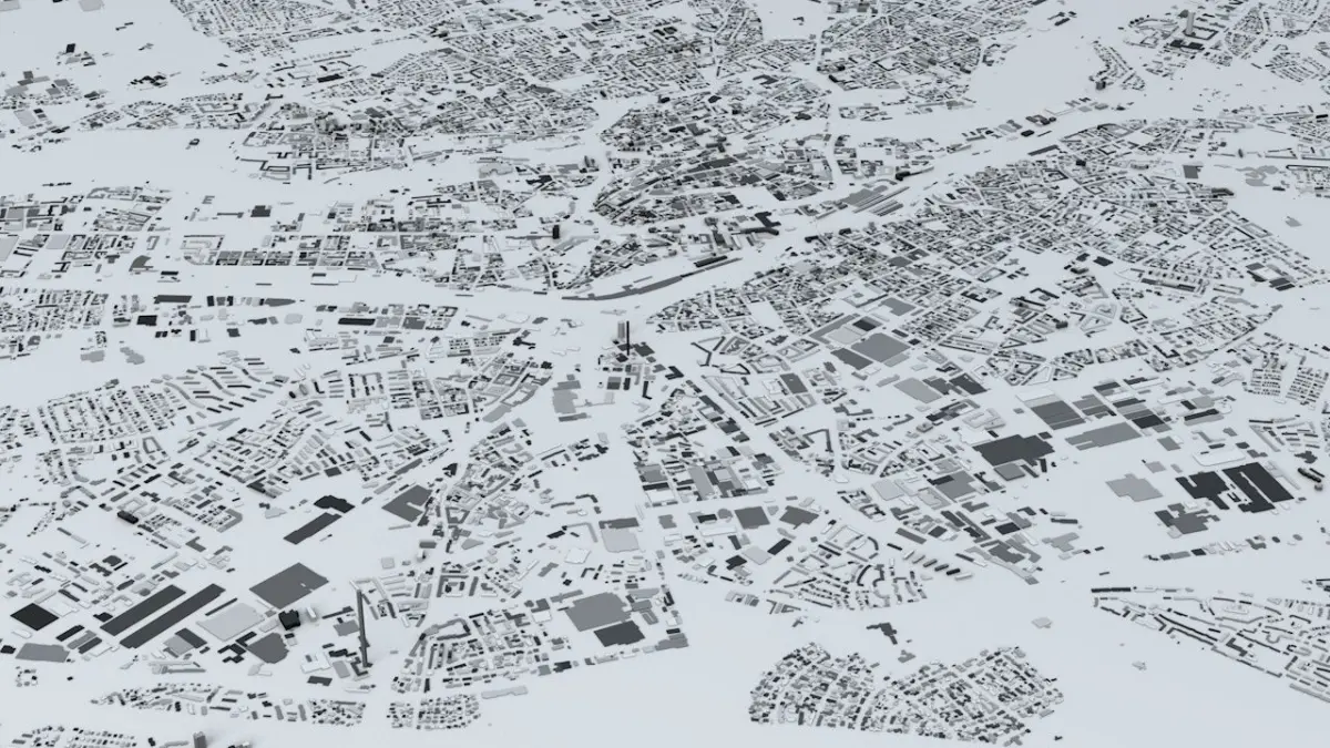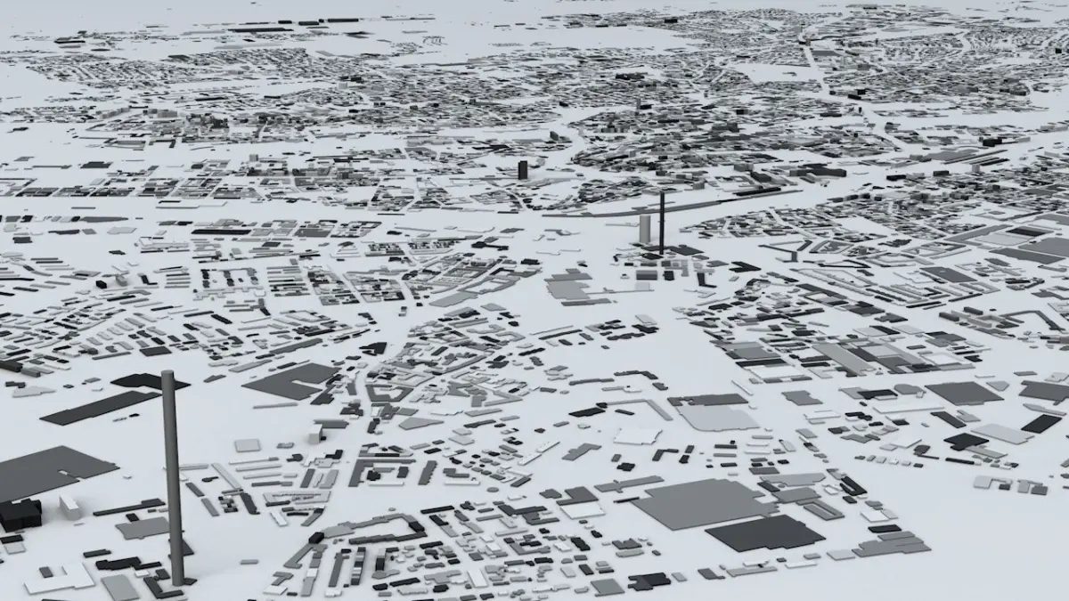 - the model is positioned on a flat surface (all buildings are on the “floor” - no elevation data included)