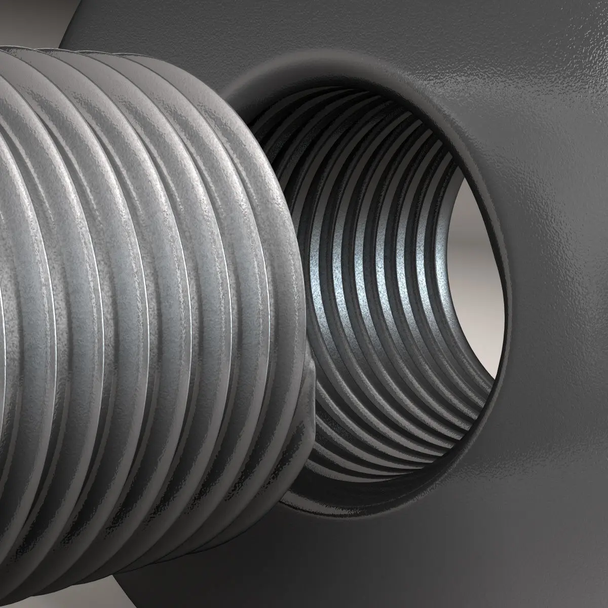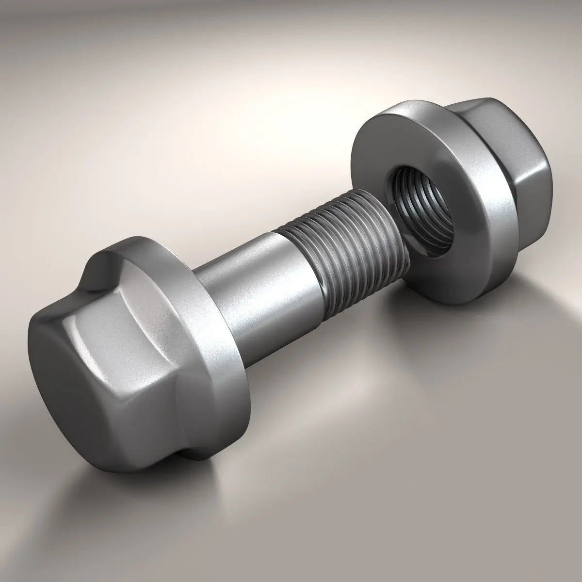 Detailed subdivisional model of a nut and bolt. This type of nuts and bolts are sometimes used for wheels of trucks or other large vehicles.