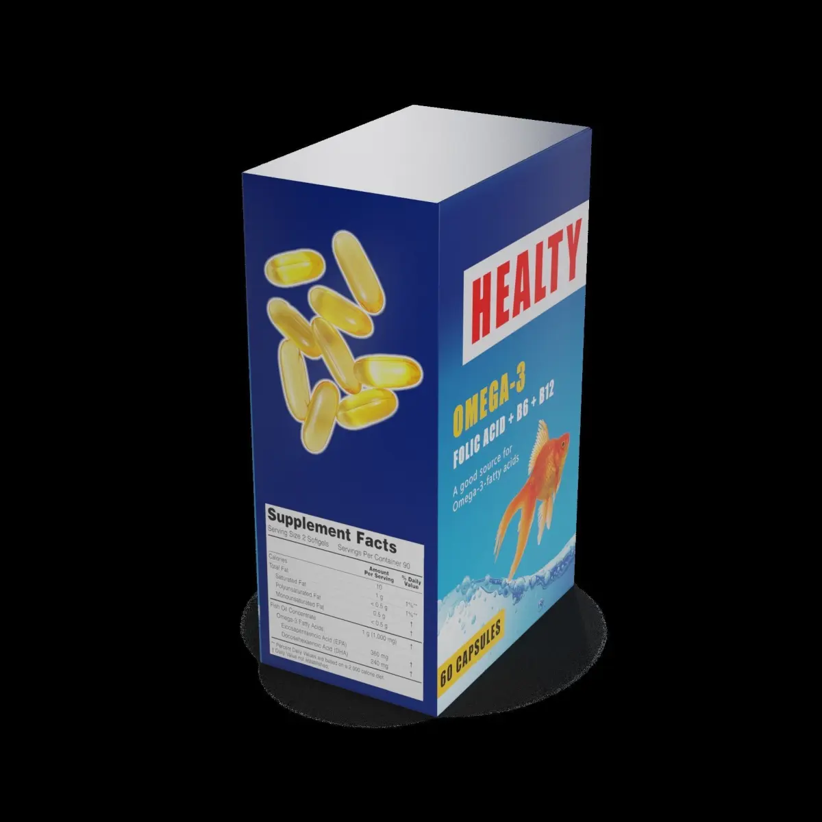 Omega-3 Fish Oil Capsules: A box of omega-3 fish oil capsules, containing 60 softgel capsules. The box is made of sturdy cardboard with a glossy finish. The capsules are stored in a clear plastic blister pack, ensuring their freshness and preventing any leakage. The label on the box features a graphic of a fish swimming in the ocean, indicating the source of the omega-3 fatty acids. The label also includes text highlighting the health benefits of omega-3.