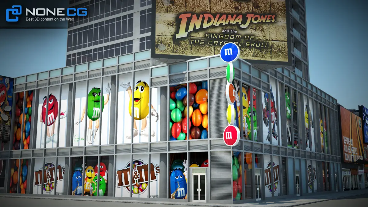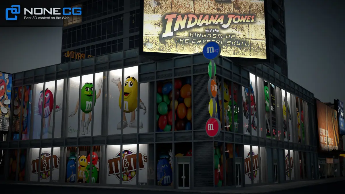 Realistic M&M´s Building 3D model with billboards and animated nightlights and windows.
