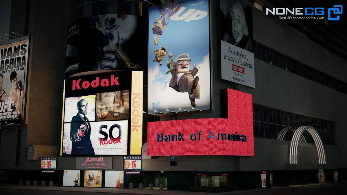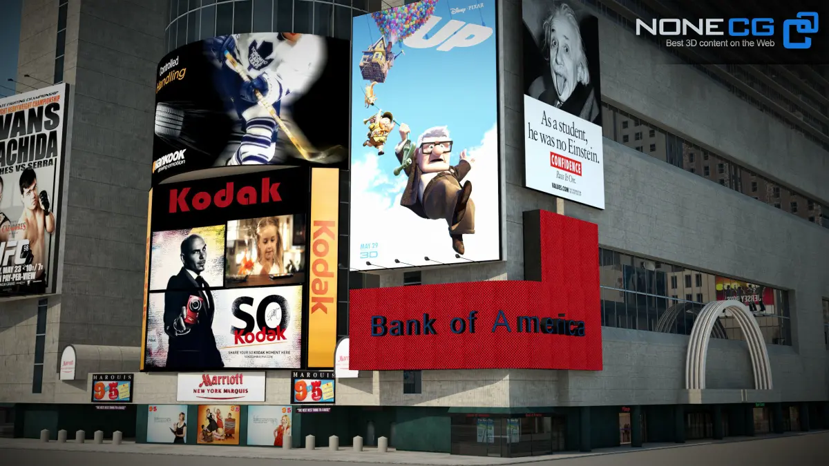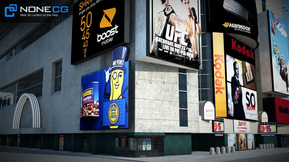 Realistic Marriott Marquis Building 3D model with billboards and animated nightlights and windows.UV mapped and textured with high resolution maps.