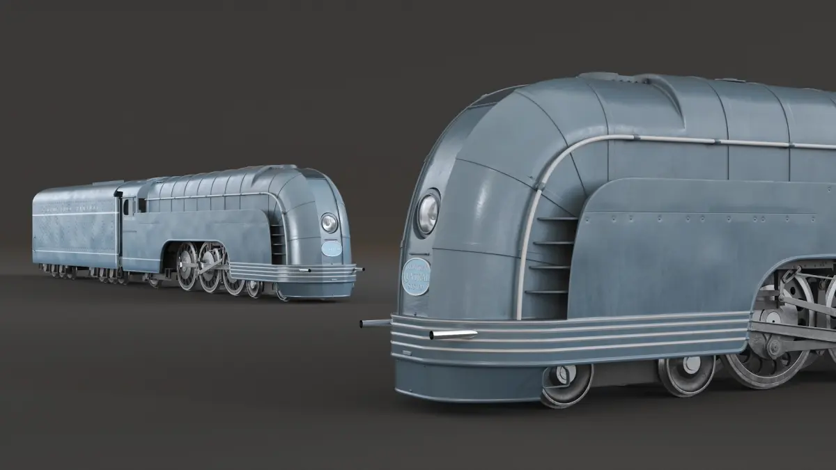 For transportation history studies, industrial design education, American railway heritage, Art Deco design showcases, transportation museums, engineering exhibitions, streamlining design analysis, model train collecting, historical recreations, promotional displays, product design comparison, and educational reference in locomotive evolution.