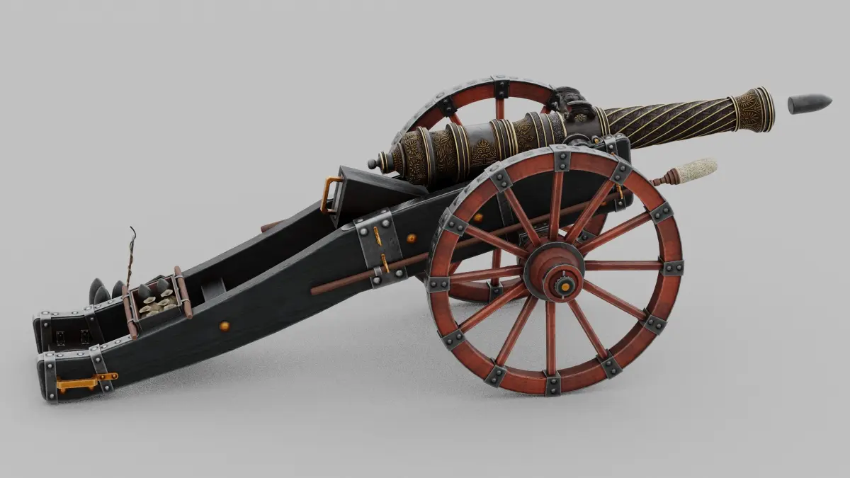 This kit contains a modular cannon in a royal imperial style on a field gun carrier with powder canisters, rifle cannon balls, lintstock, movable chest, rammer and sponge. This kit is compatible with all other elements of the same cannon kit.
