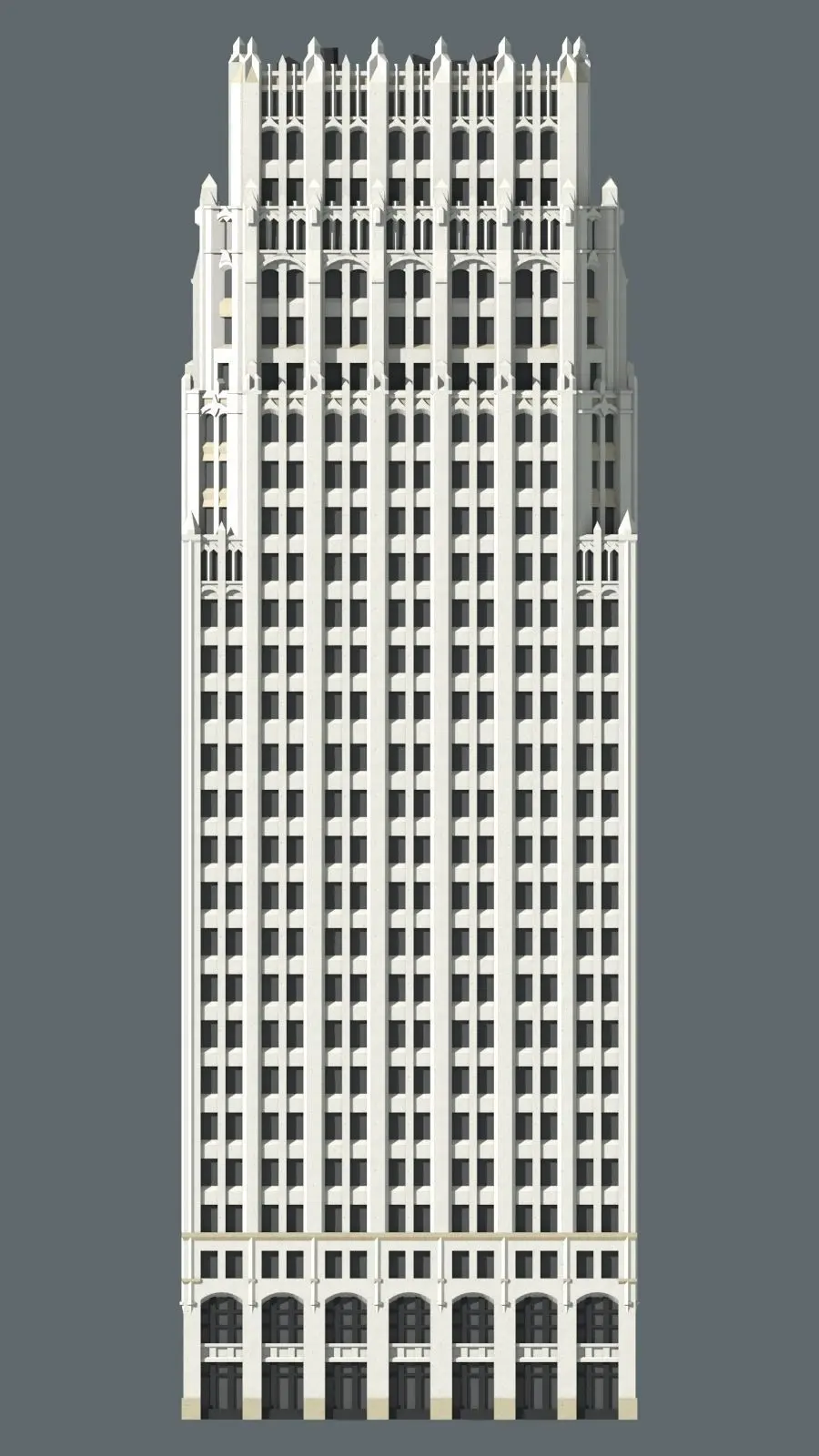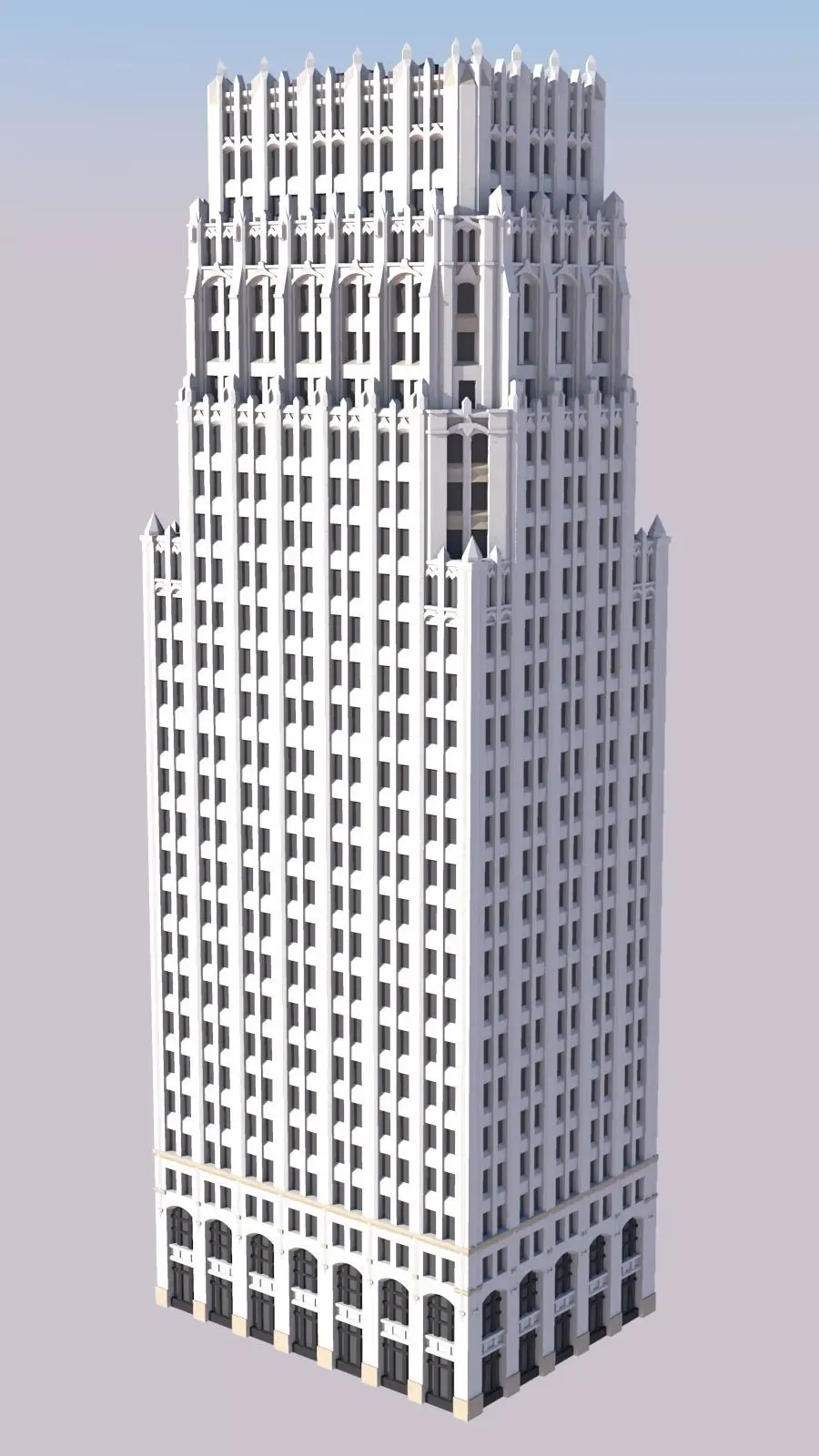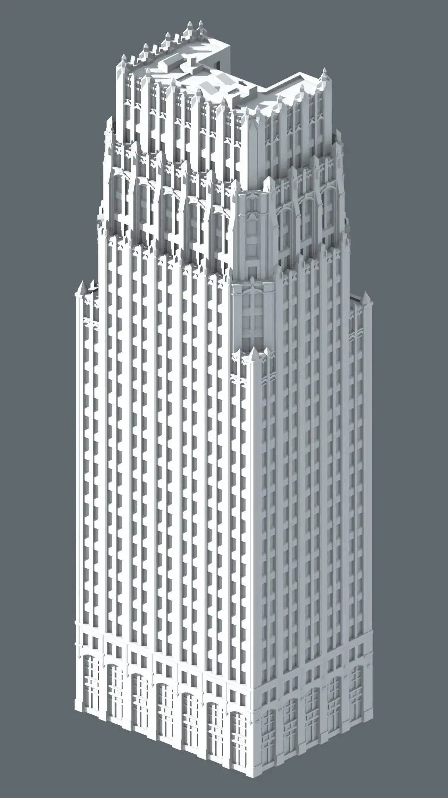 In 1974, when the building was sold to new owners, its magnificent gothic ornamentation was buried beneath stucco. While today the tower's historic facade remains hidden, this model aims to recreate the original design in its full beauty.