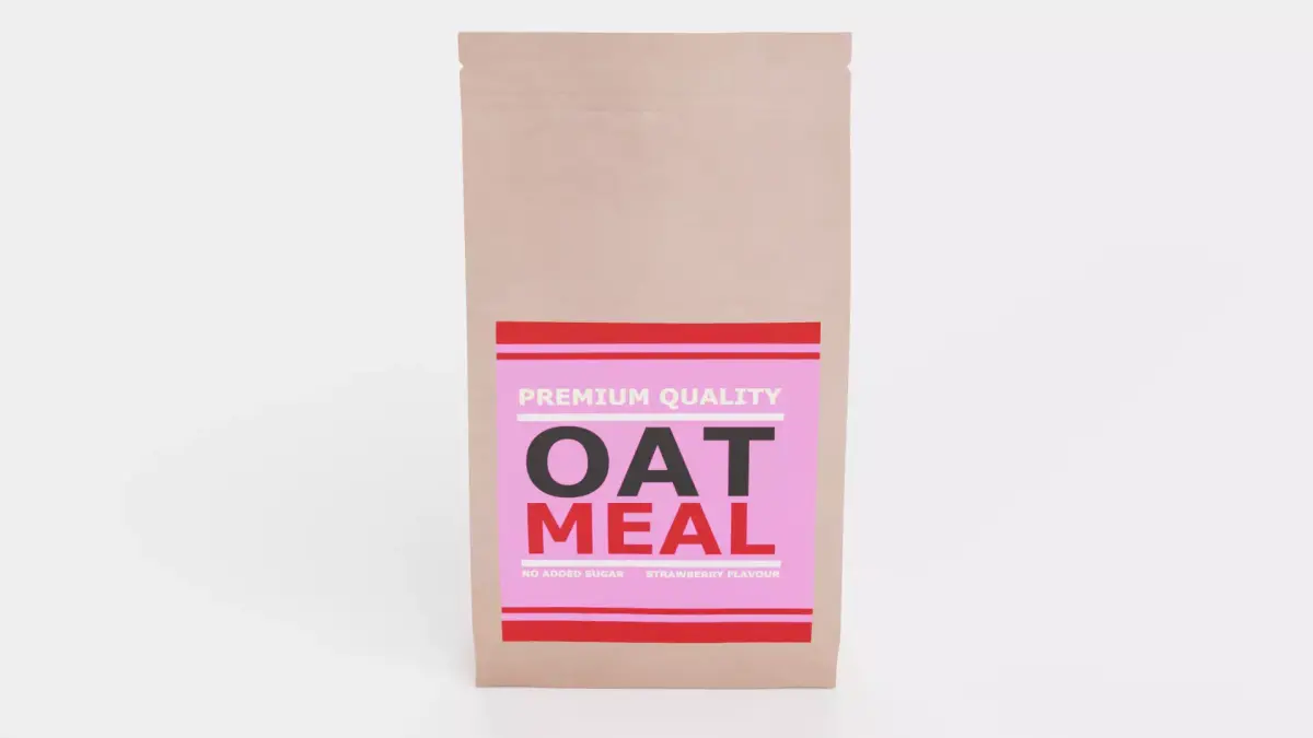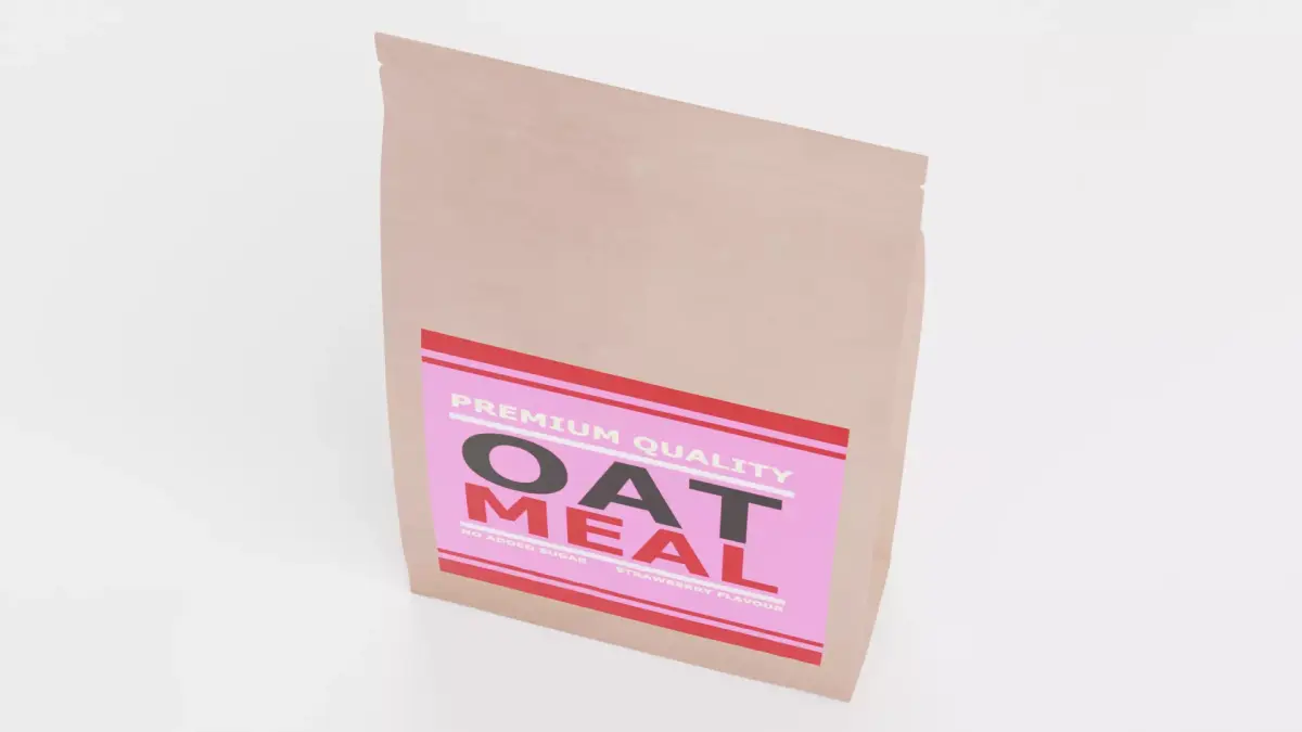 A realistic 3D model of a Oat Meal pouch designed as a brand-neutral supplement container with clean proportions and a production-ready look. This concept emphasizes modern, minimal design and accurate form factor, representing a timeless, professional packaging aesthetic for sport nutrition packaging – without any brand association.