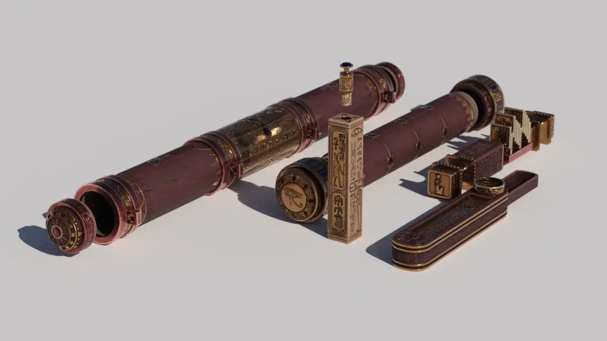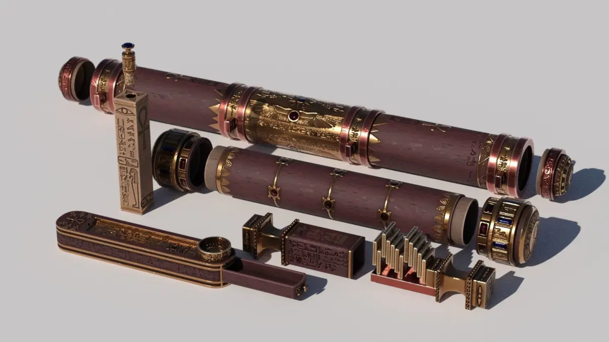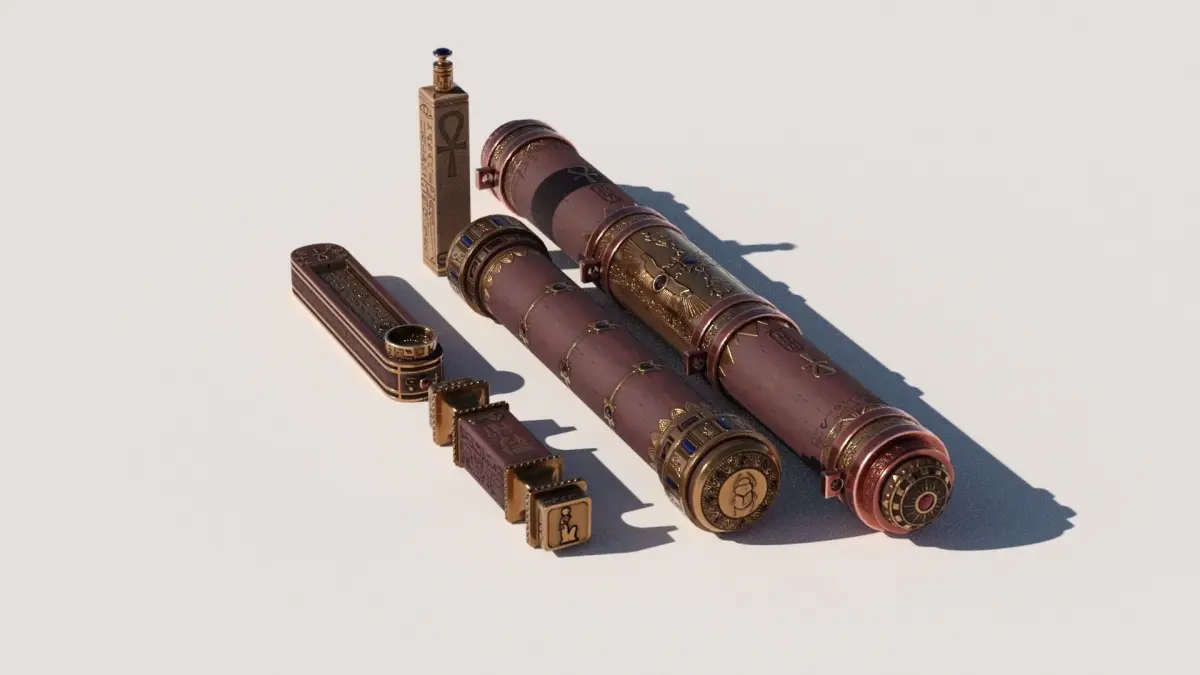 Fictional ancient Egyptian styled container kit. Containing two heavily ornamented tubes with caps, a small flask, an incense box with a small drawer and a small box with 12 metal tokens. Heavily ornamented with gold and red gems on red wood. Made to be used by a necromancer, pharaoh or death priest.