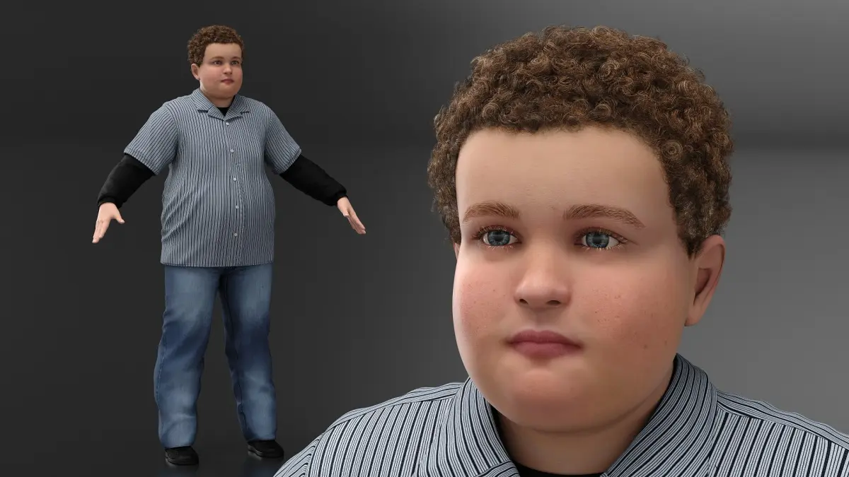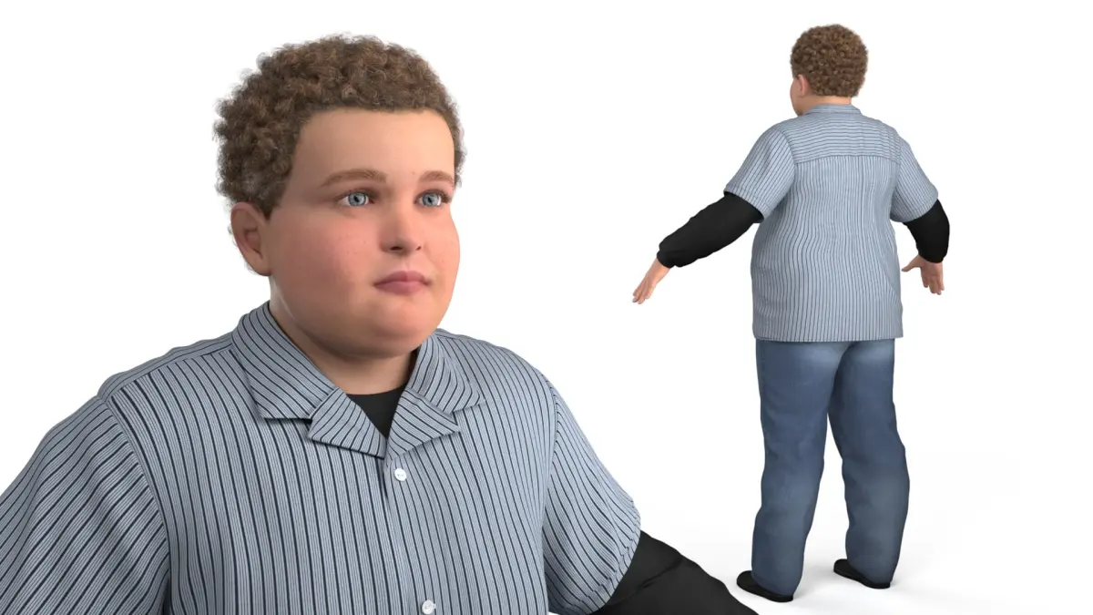 Obese Boy is a high quality, photo real 3d model that will enhance detail and realism to any of your rendering projects. The model has a fully textured, detailed design that allows for close-up renders, and was originally modeled in 3ds Max 2020 and rendered with V-Ray. Renders have no postprocessing!